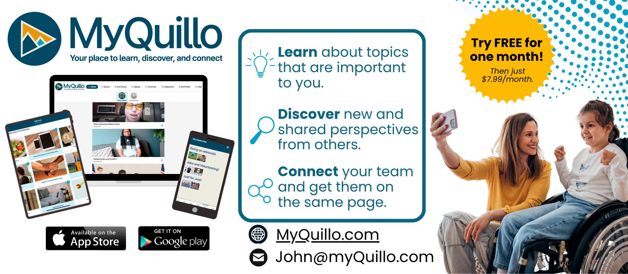 As an app and digital platform for your phone, tablet, or computer, MyQuillo connects people with intellectual and developmental disabilities and their families with ideas and resources through short videos. Get everyone on the same page as you build the life you want—whether planning ahead, navigating systems, or finding community.