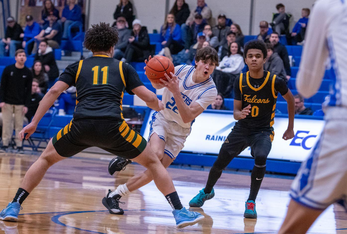 Eatonville sophomore Sam Kralik splits a pair of Falcon defenders on his way to the basket for two of his career-high 10 points in his first varsity start for Eatonville in the Cruisers 55-52 victory over Foss this past Friday evening at Rainier Connect Arena.