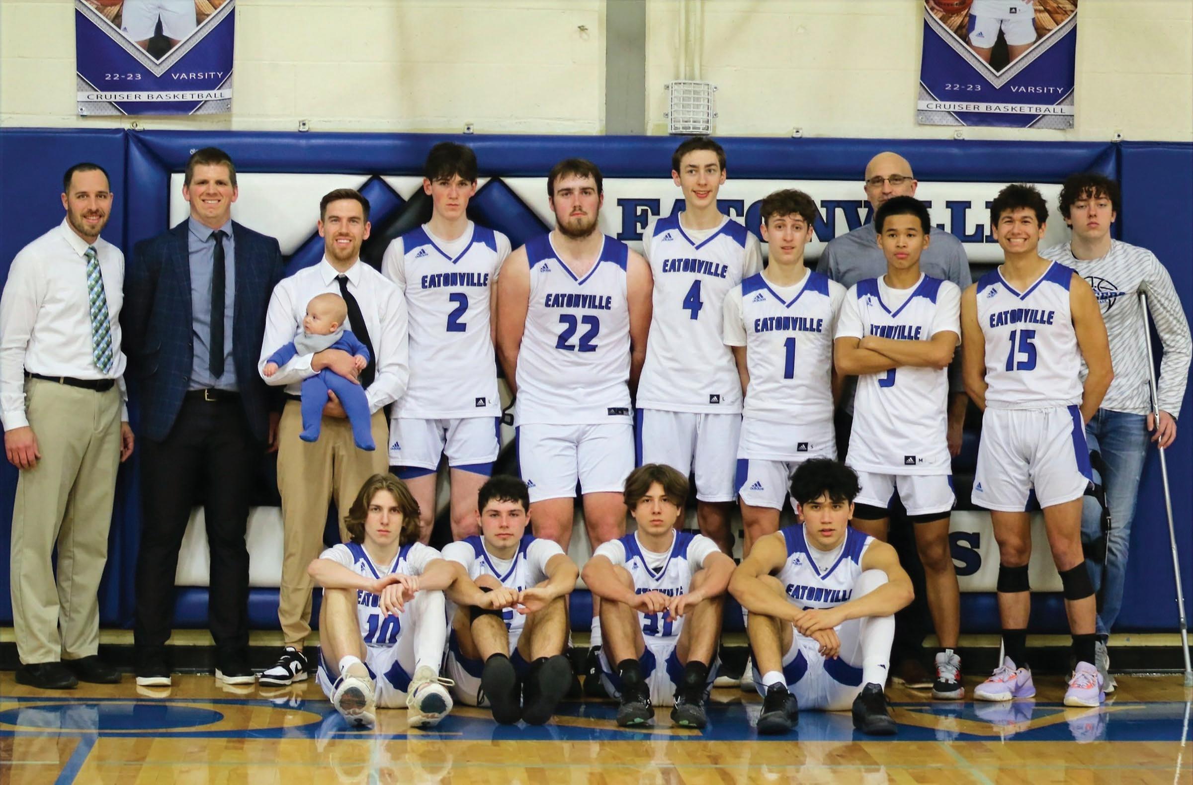 The 2022-23 Eatonville boys basketball team poses for a photo following the Cruisers’ Evergreen Conference title-clinching win over Tenino Jan. 26.
