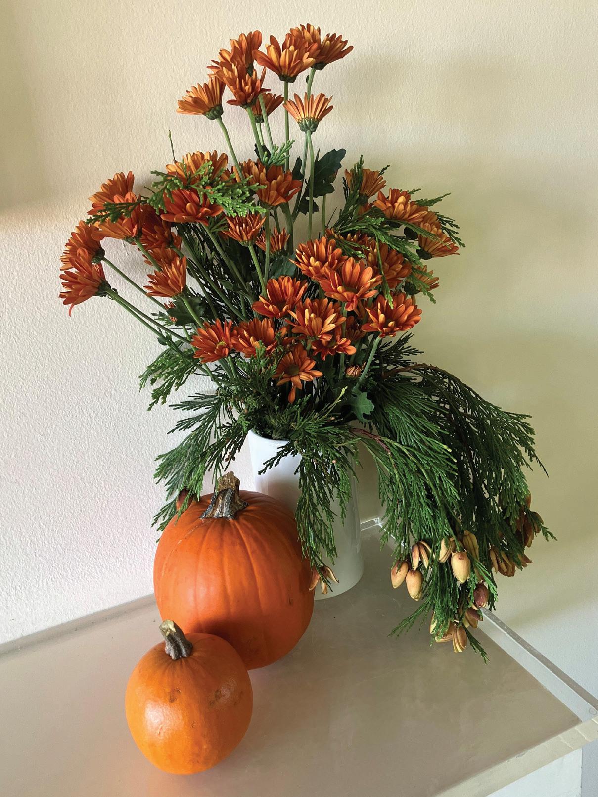 Look closely at the photograph of the branches that were used in the chrysanthemum arrangement, pictured here. You’ll see a number of the tiny cones filling the ends of the shoots. These cones appear at this time of year, embellishing the trees for autumn and into winter. The cones drop seeds which often sprout.