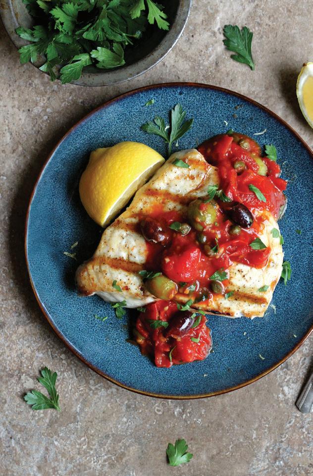 GRILLED SWORDFISH WITH ROASTED TOMATO, PEPPER AND OLIVE SAUCE