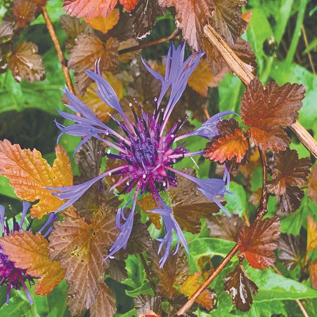 capitatus is a green-leafed Paci c Northwest native that can reach 12 feet tall, but most of the colorful cultivars in nurseries are cultivars of P. opulfolius (“opulent foliage”), which is native to eastern North America. Ninebarks like consistent moisture and full sun to partial shade. It took a while for me to get P. “Center Glow” established in a rather tough section; it has an obstructed view seat facing the house and competes with a neighbor’s bay laurel hedge for water. Now its juicy copper tones set off its plant neighbors beautifully, from golden Choisya “Gold Finger” to steely blue-leafed Rosa glauca to the purple flowers of Centaurea montana. It starts out amber with gold glints and matures to burgundy in autumn. Until now, the only thing stopping me from lling my yard with ninebarks was their size. Generally, they run about 5 to 6 feet tall and 3 feet wide and need no pruning. ey are occasionally troubled by powdery mildew, so allow some elbow room for air circulation. Having caught the attention of breeders, there are more shiny new