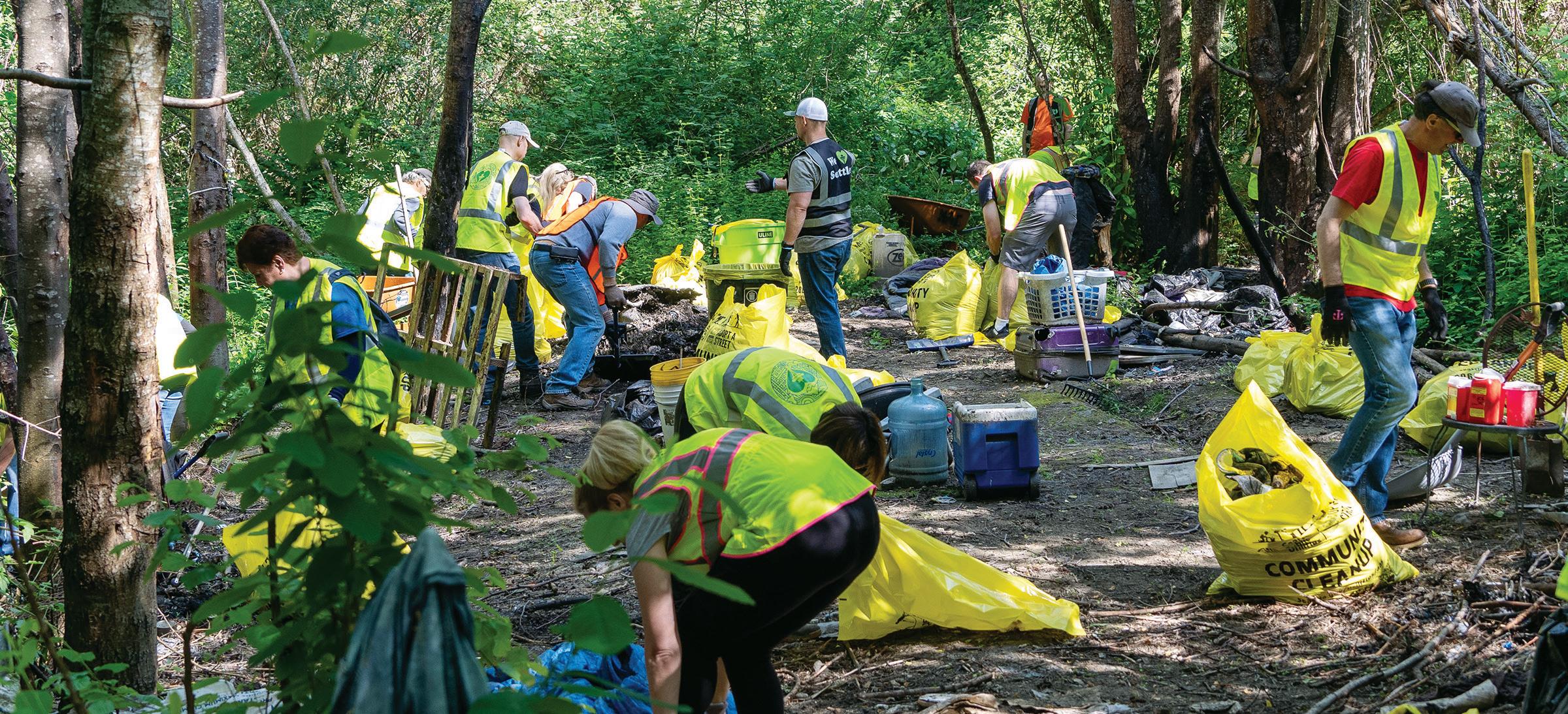 We Heart Seattle volunteers pick up trash accumulated on the Southwest Queen Anne Greenbelt during Mayor Harrell’s One Seattle Day of Service, May 20.