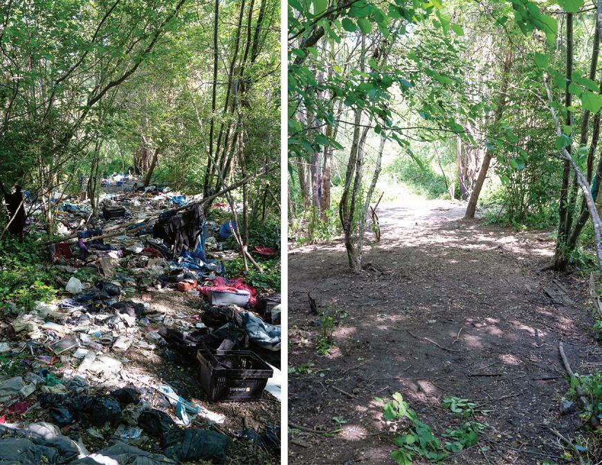 What the same area of a section of the Queen Anne Greenbelt looked like before and after volunteers cleaned it up during Mayor Harrell’s One Seattle Day of Service, May 20.
