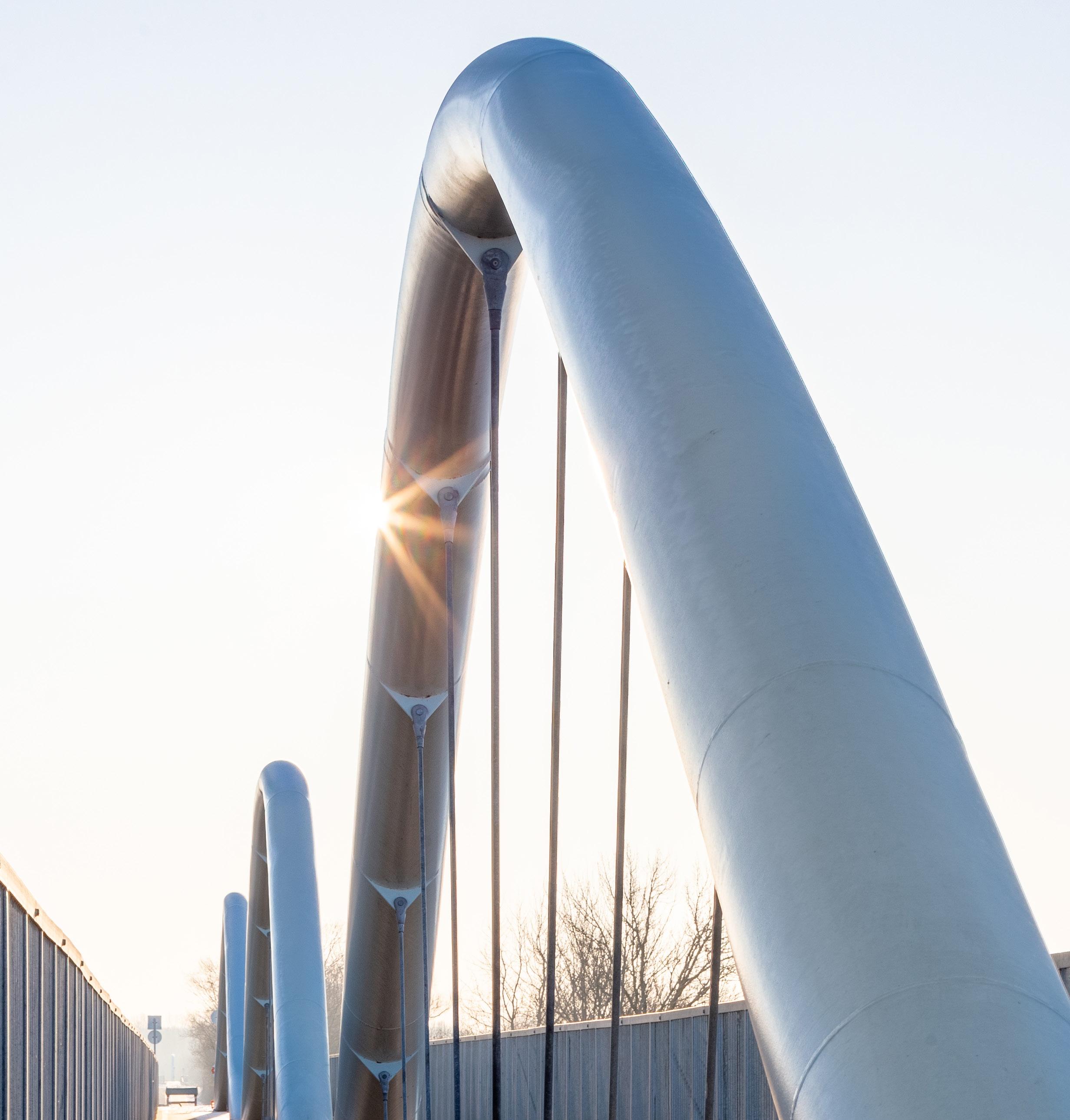 The wave motif is a dominant feature of the concept. The two side-spans are arched truss structures, while the mid-spans over the riverbed are tied-arch bridges. The arches rise 8.25 m above the deck level, and descend 2,73 m at the piers.