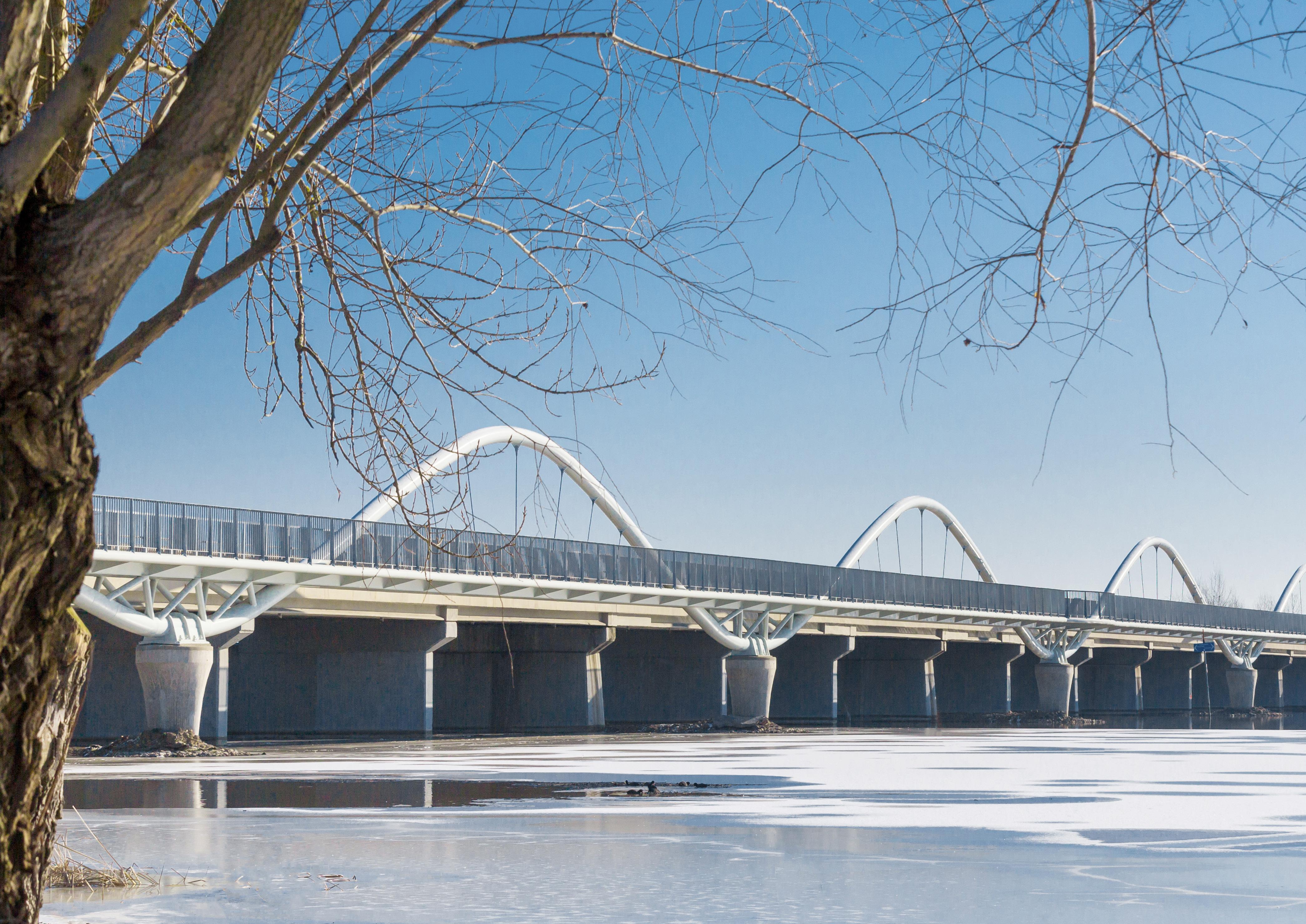 The „infinity” sinusoid arch form is unique to the world. Several innovative technical details had to be applied in order to achieve its final shape. Its structure is a lower deck and deck steel arch bridge with box cross-section bracing bracket with an ortothropic deck plate having nine supports.