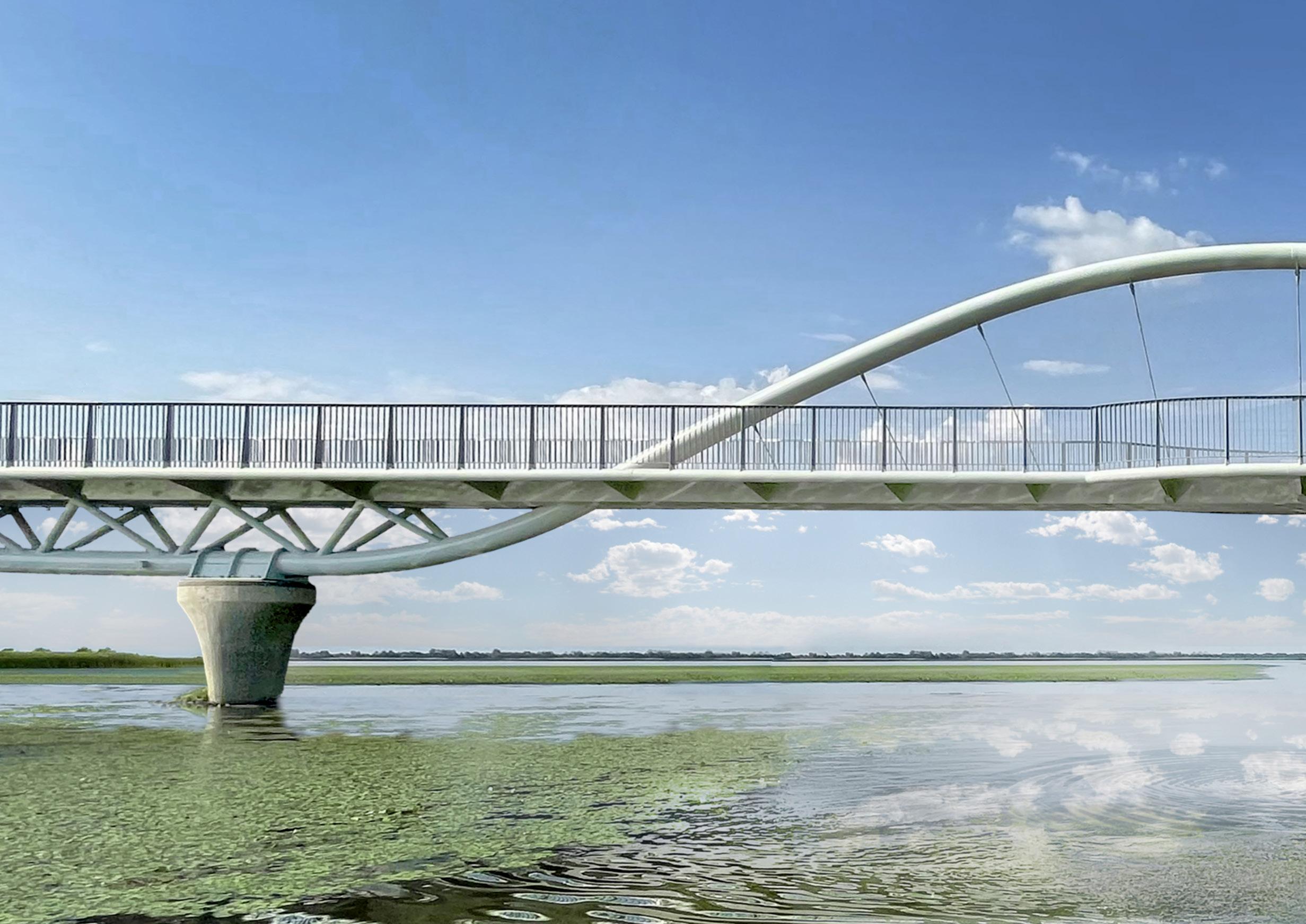 Location: Lake Tisza, HU Year: 2019 Status: Complete Material: Steel Function: Cycle No. of spans: 3 Surface: 300 m2 Length: 80 m Main span: 51 m Structure: Arch bridge Awards: Cycle Bridge of the Year, MAGÉSZ award