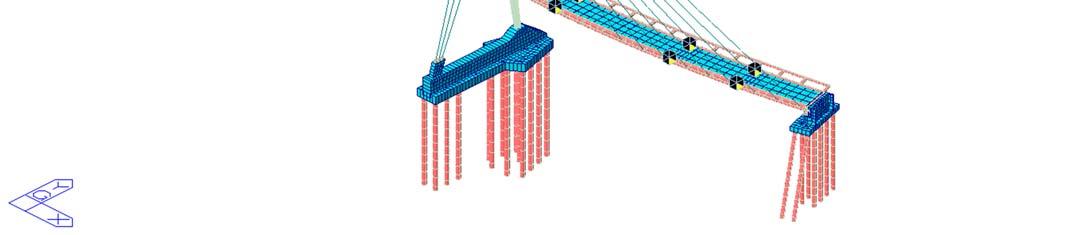 A ferdekábeles hídszerkezeten áthaladó gyalogosok által keltett dinamikus hatásokat dinamikai számításokkal vizsgáltuk. A hídon közlekedő gyalogosok számára megfelelő komfortszint (rezgés, gyorsulás) biztosítása érdekében csillapító berendezéseket irányoztunk elő.