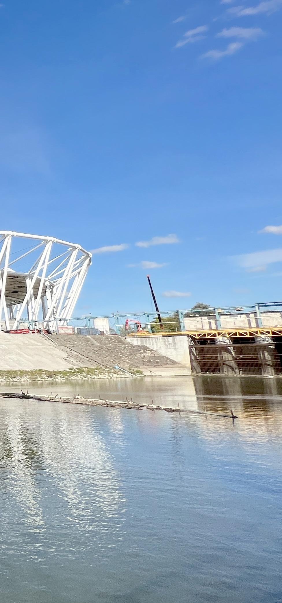 A pilon teljes acélszerkezete 69,80 m hosszúságú, melyet 5 gyártási egységből állítottak össze egy TS80 bárkán.