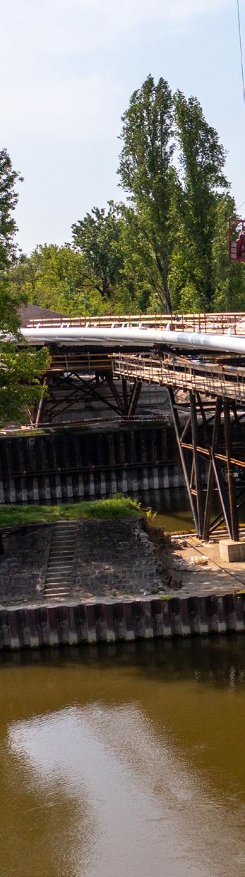 steel tubular sections with 30 mm wall thickness, which had to be bent to follow the spatial curvature of the bridge deck. The crossbeams and the orthotropic steel deck were made of S355 M steel, while the box sections, edge pipes, and crossbeam cantilevers were made of S460 ML steel. Both the main and edge beams of the steel tubes were filled with concrete in order to increase their capacity.