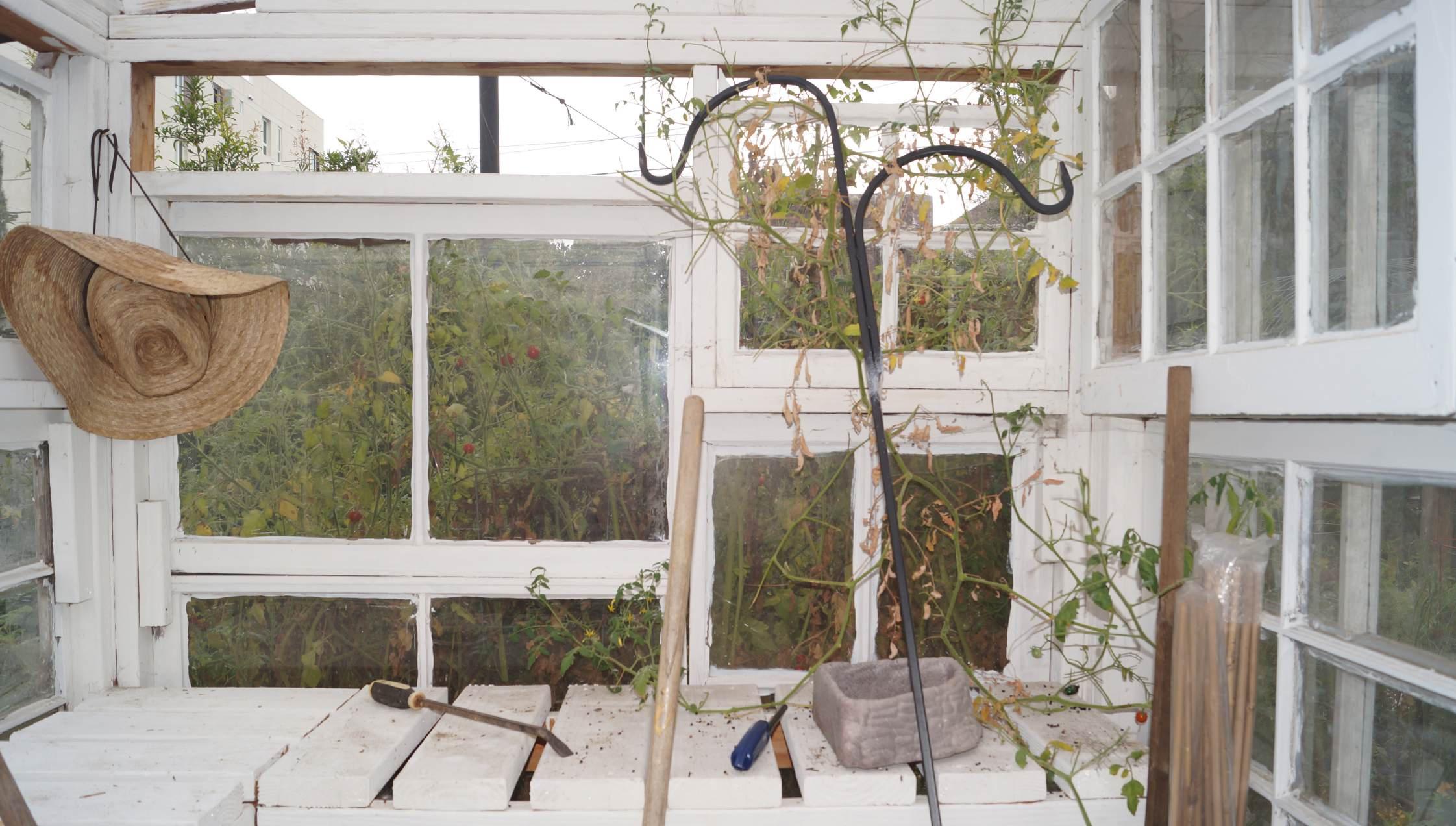 Unearthing the soil that had been suffocated for a century by thick concrete was as cathartic as it was intensive. The soil, stripped of its nutrients and riddled with clay pipes and trash, was begging for reinvigoration. Restoring it took months of digging and pit composting, a technique in which compost is buried deep into the ground to oxygenate it from the bottom up. Once finished, nitrogen-rich clover was planted all over the lot before being outfitted with a drip irrigation system. Within a year, the space was unrecognizable, enveloped in green. Complete with a family of chatty chickens and a collection of 60,000 bees, it now thrives as an “experimental garden.”
