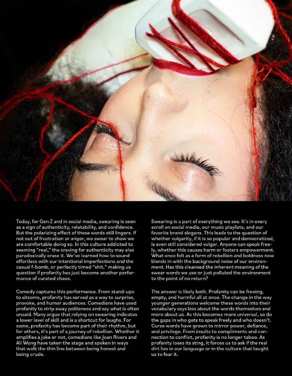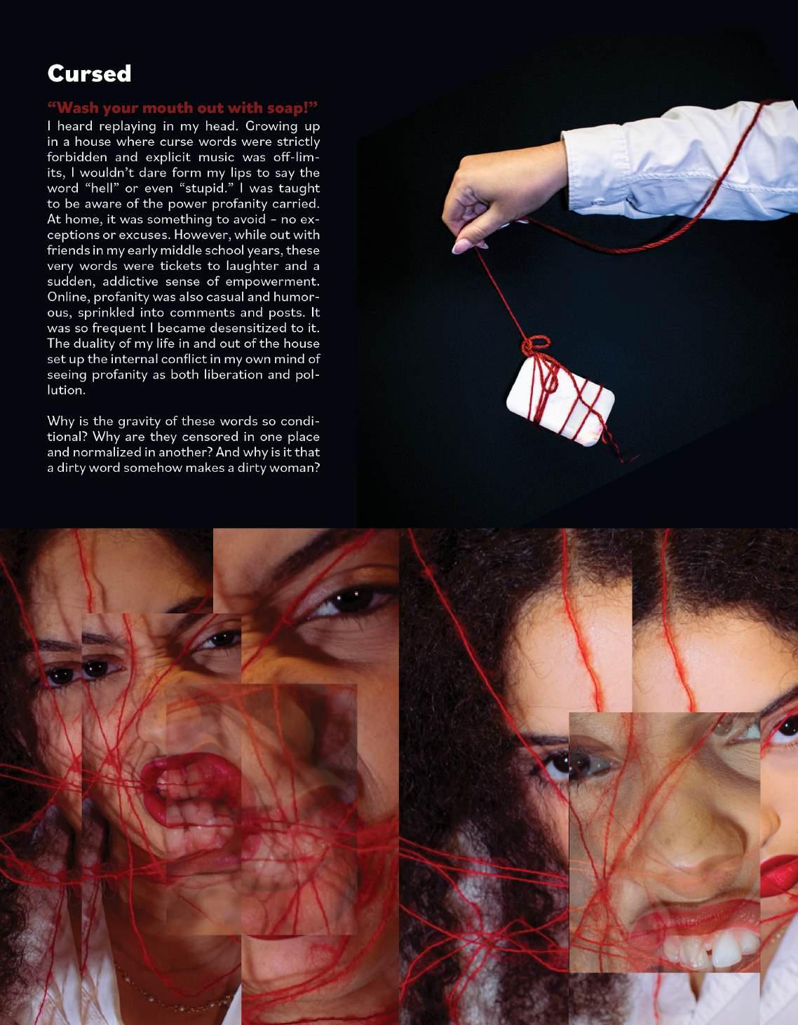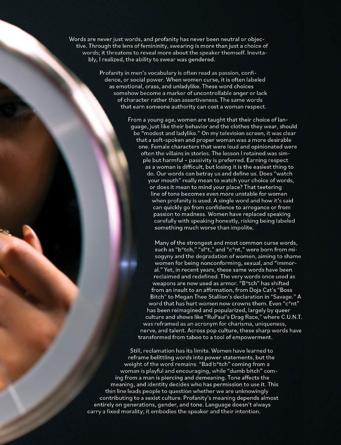 I heard replaying in my own mind. Growing up in a house where curse words were strictly forbidden and no explicit tracks could be played, and I wouldn’t even dare form my lips to say “hell” or even “stupid.” I was taught to be aware of the power pro fanity carried. At home, it was something to avoid – no exceptions or excuses. However, while out with friends in my early middle school years, these very words were always sure to get a laugh followed by an addictive feeling of empowerment. Online, profanity was also casual and humorous. It was fre quent and I gradually became desensitized to it. The duality of my life in and out of the house set up the internal con mind of seeing profanity as both liberation and pollution. Why is the gravity of these words so conditional? Why are they cen sored in one place and normalized in anoth er? And why is it that a dir makes a dirty woman?