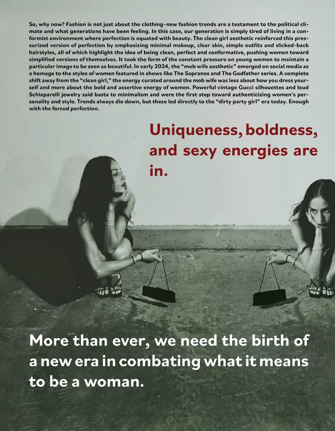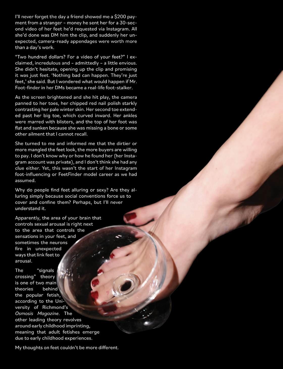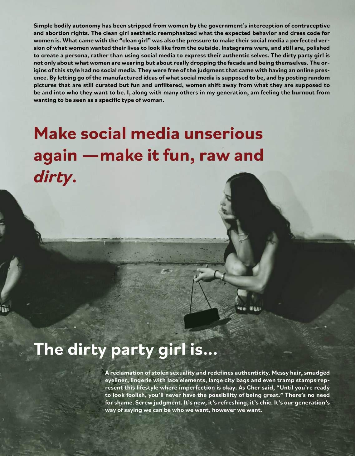 I heard replaying in my own mind. Growing up in a house where curse words were strictly forbidden and no explicit tracks could be played, and I wouldn’t even dare form my lips to say “hell” or even “stupid.” I was taught to be aware of the power pro fanity carried. At home, it was something to avoid – no exceptions or excuses. However, while out with friends in my early middle school years, these very words were always sure to get a laugh followed by an addictive feeling of empowerment. Online, profanity was also casual and humorous. It was fre quent and I gradually became desensitized to it. The duality of my life in and out of the house set up the internal con mind of seeing profanity as both liberation and pollution. Why is the gravity of these words so conditional? Why are they cen sored in one place and normalized in anoth er? And why is it that a dir makes a dirty woman?
