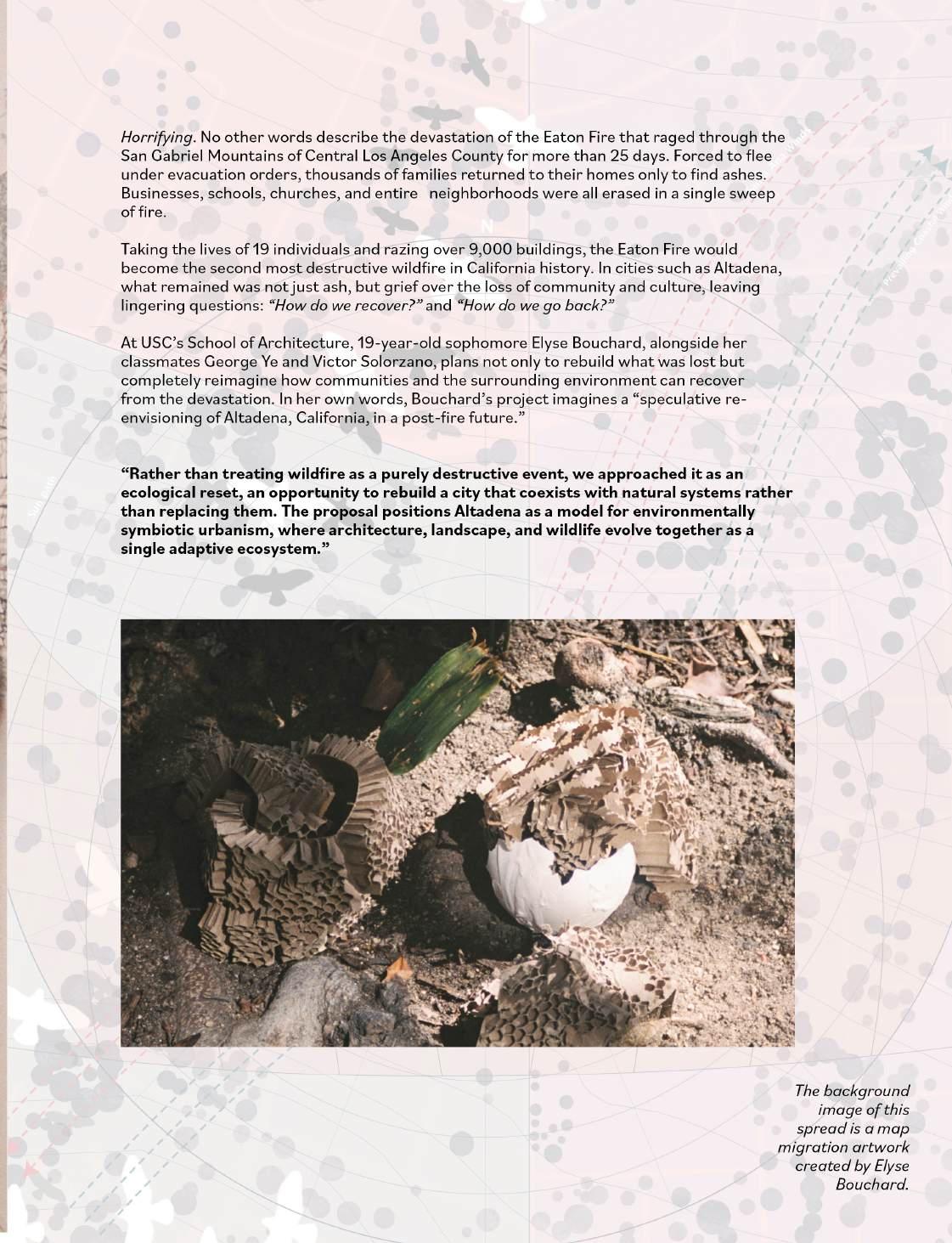 “For me, it became a study of how rebuilding after trauma, whether ecological or human, requires imagination, care, and a willingness to coexist with uncertainty.”