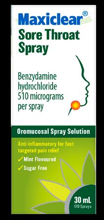 Maxiclear® Sore Throat Spray is a mint-flavoured, sugar-free antiinflammatory for the temporary relief from the symptoms of sore throat, pharyngitis, tonsillitis, mouth ulcers, redness and inflammatory conditions, pain following mouth or oral surgery, radiation mucositis, pain following dental procedures.