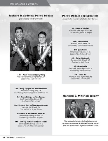 2nd – Emily Gordon Rowland Hall-St. Mark, UT Coached by: Michael Shackelford 3rd – Julia Henry Hutchinson High School, KS Coached by: Zachary Brown 4th – Carter Martindale Sky View High School, UT Coached by: Jody Orme 5th – Brian Roche Glenbrook South High School, IL Coached by: Jonathan Voss 1st – Raam Tambe and Jerry Wang Palos Verdes Peninsula High School, CA Coached by: Scott Wheeler
