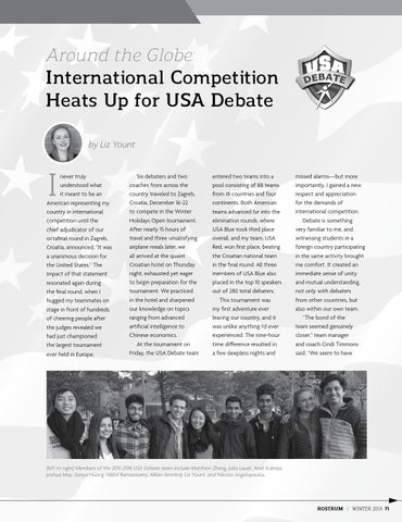 missed alarms—but more importantly, I gained a new respect and appreciation for the demands of international competition. Debate is something very familiar to me, and witnessing students in a foreign country participating in the same activity brought me comfort. It created an immediate sense of unity and mutual understanding, not only with debaters from other countries, but also within our own team. “The bond of the team seemed genuinely closer,” team manager and coach Cindi Timmons said. “We seem to have