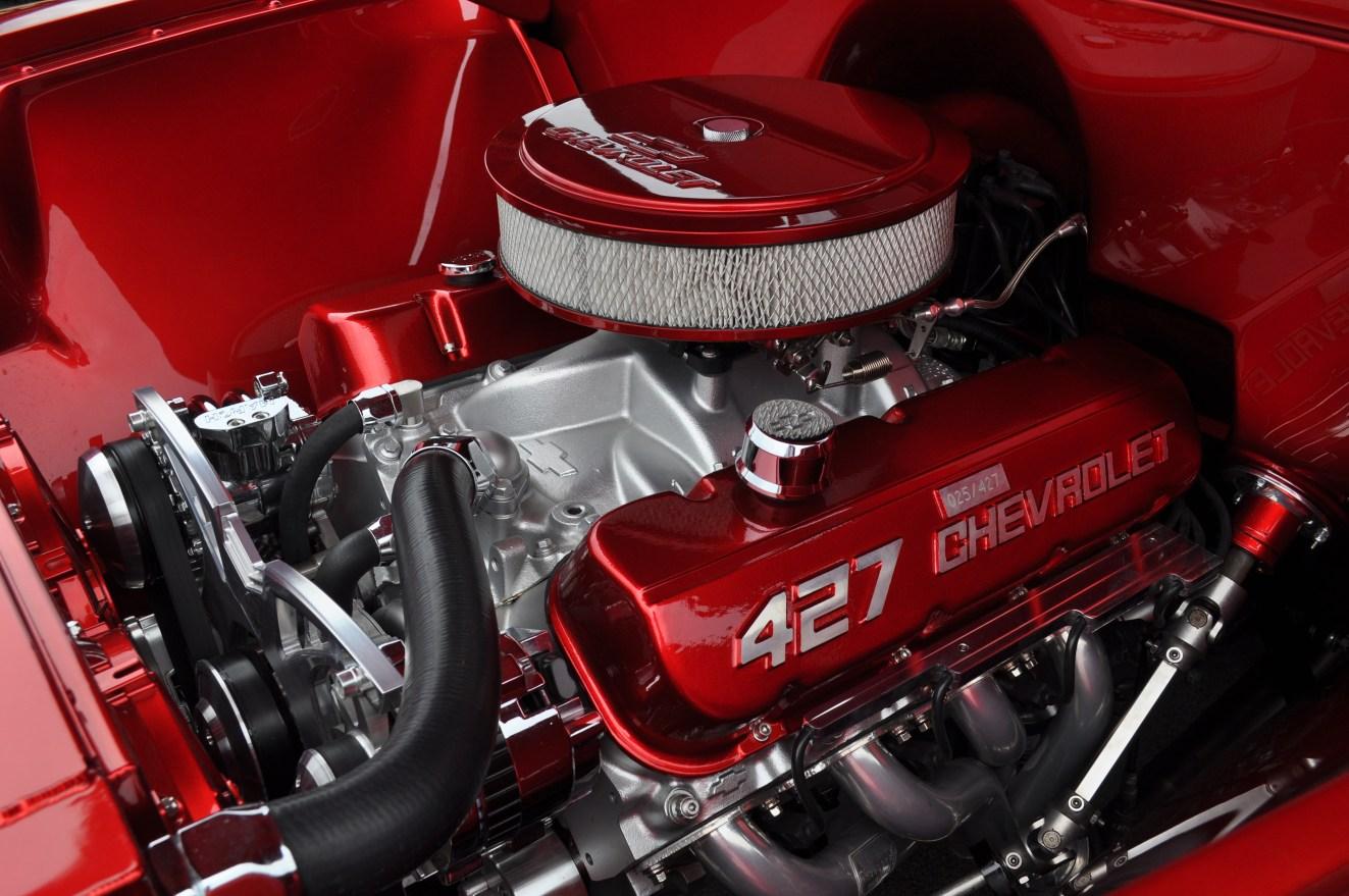 The Willys sits on a custom chromoly tube frame with a unique Watt’s link rear suspension and independent front suspension. Under the hand-formed three-piece hood is a detailed small-block Chevy built by Panella Racing Engines, topped with a supercharger and electronic fuel injection system. The Willys body underwent a lot of modifications, including reformed fenders and floor, a sectioned grille, custom running boards, and even one-off emblems. Passengers are protected by a roll cage and sit in a ‘60s-flavored interior with vintage gauges, steering wheel and pleated interior panels.