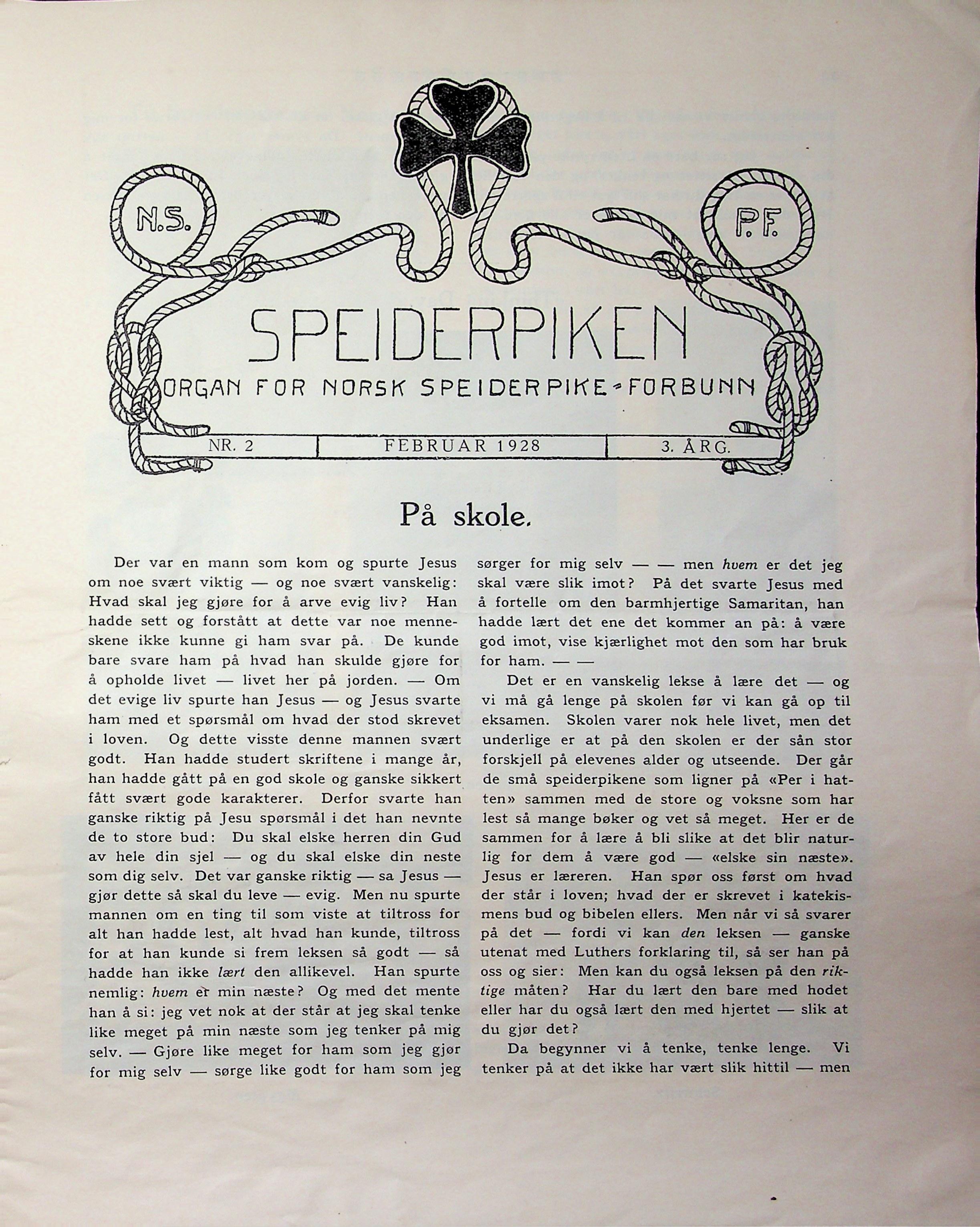 Det er en vanskelig lekse å lære det - og vi må gå lenge på skolen før vi kan gå op til eksamen. Skolen varer nok hele livet, men det underlige er at på den skolen er der sån stor for s kjell på elevenes alder og utseende. Der går de små speiderpikene som ligner på «Per i hatte n» s ammen med de store og voksne som har lest så mange bøker og vet så meget. Her er de sammen for å lære å bli slike at det blir naturlig for dem å være god - «elske sin næste». Jesus er læreren. Han spør oss først om hvad der står i loven; hvad der er skrevet i katekismens bud og bibelen ellers. Men når vi så svarer på det - fordi vi kan den leksen - ganske utenat med Luthers forklaring til, så ser han på oss og sier: Men kan du også leksen på den riktige måten? Har du lært den bare med hodet eller har du også lært den med hjertet - slik at du gjør det?