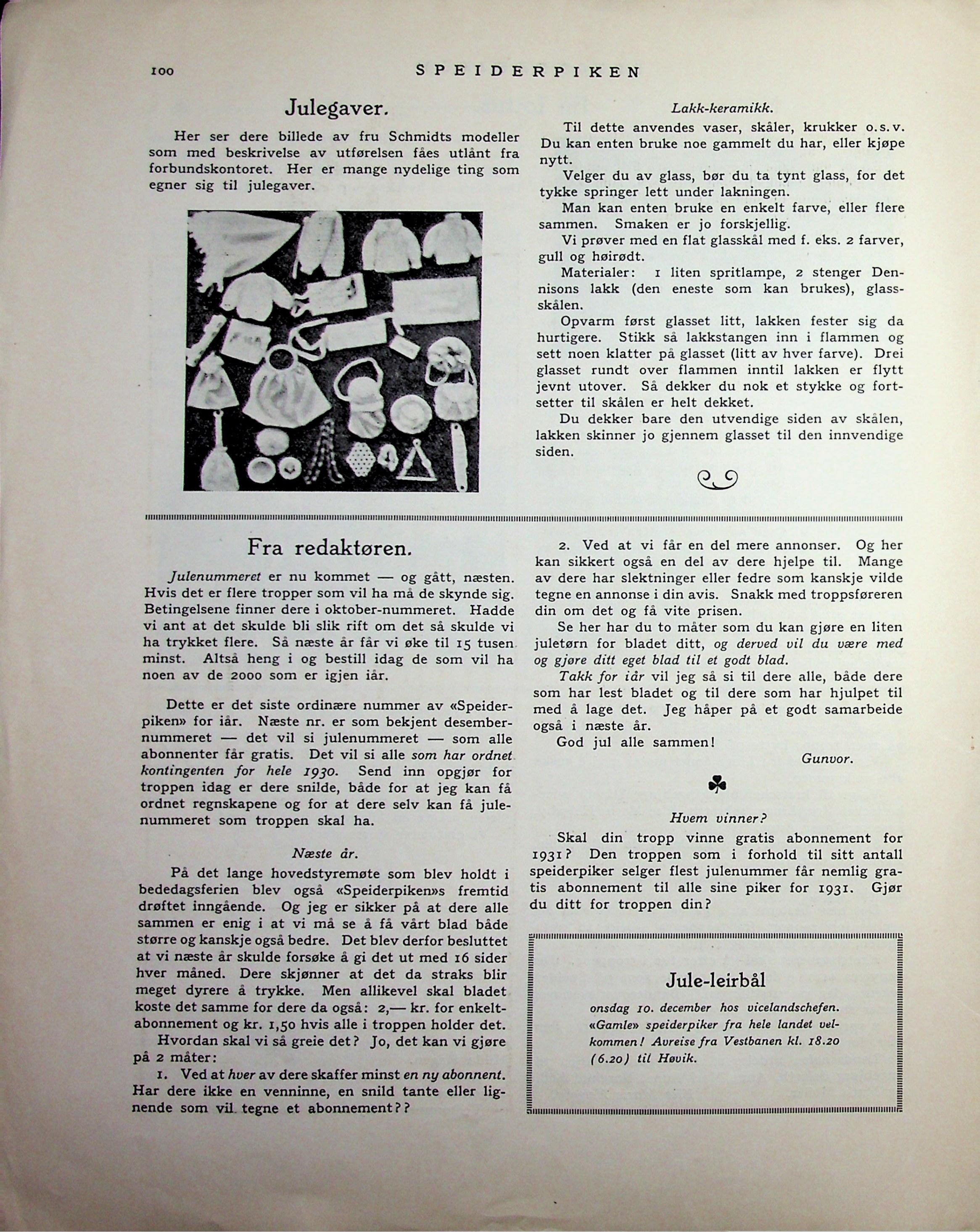 Dette er det siste ordinære nummer av «Speiderpiken» for iår. Næste nr. er som bekjent desembernummeret - det vil si julenummeret - som alle abonnenter får gratis. Det vil si alle som har ordnet kontingenten for hele I930. Send inn opgjør for troppen idag er dere snilde, både for at jeg kan få ordnet regnskapene og for at dere selv kan få julenummeret som troppen skal ha