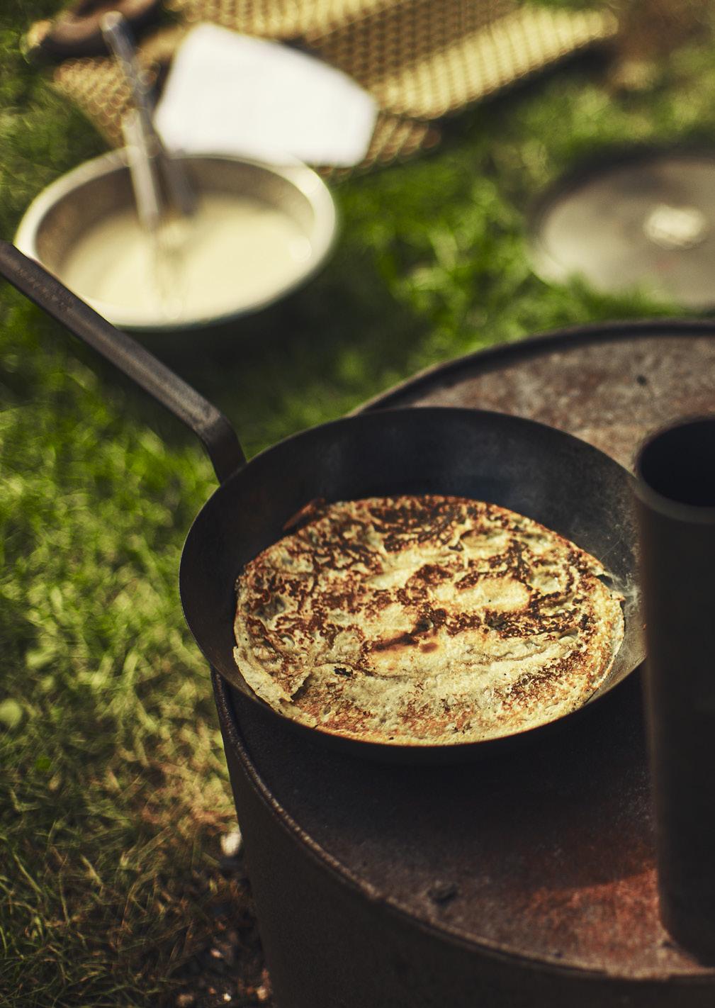 Lav et bål, som kan have en pande stående. Husk, at der skal være rolige gløder til denne opskrift.