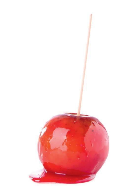 Sådan gør I → Fjern stilk og blomst fra æblerne. Vask og tør æblerne godt. Sæt en pind igennem æblet på stilkens plads.
