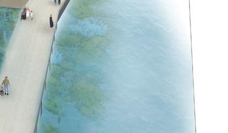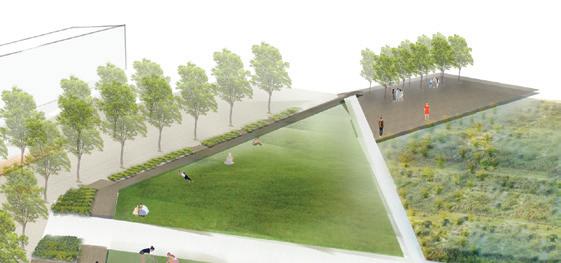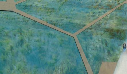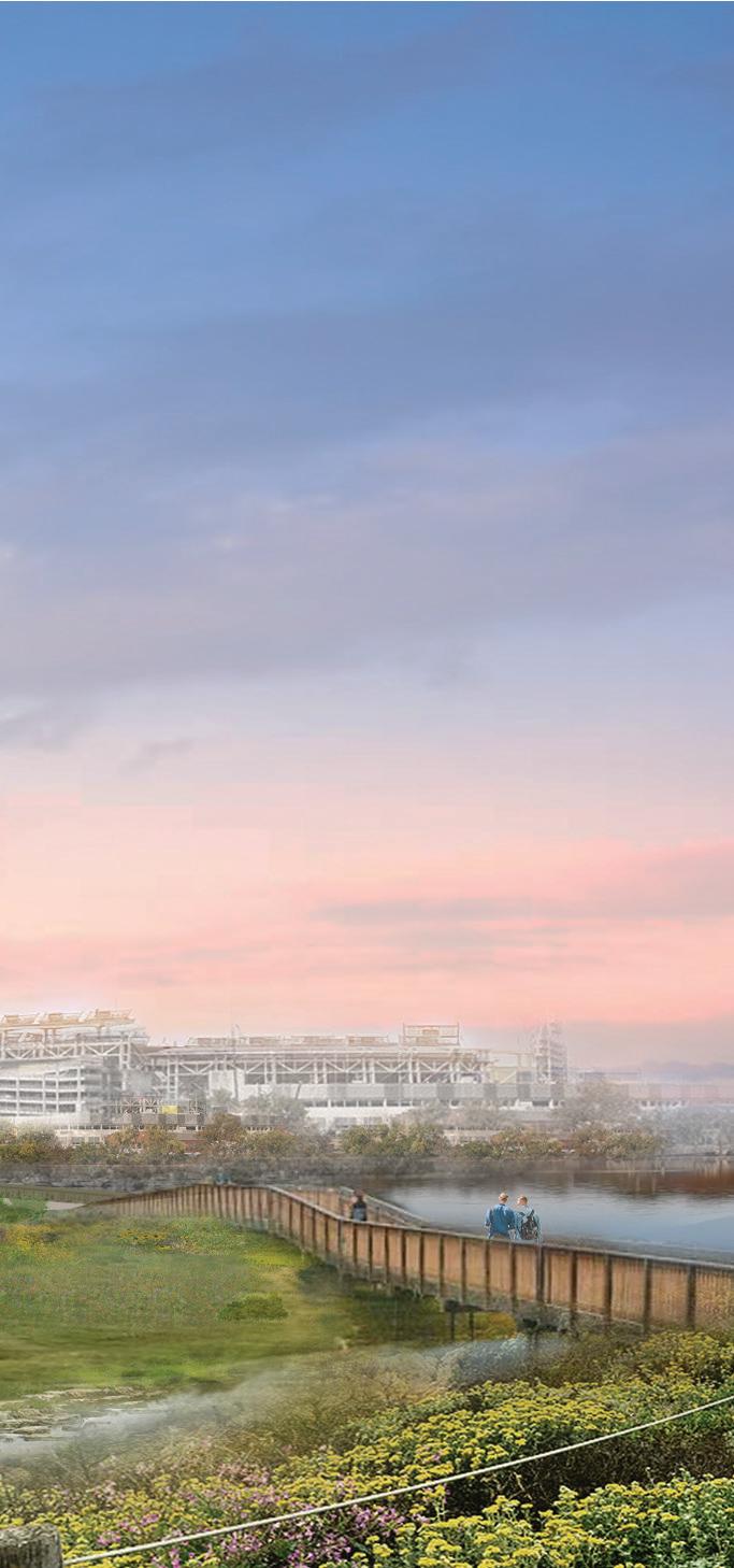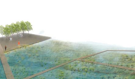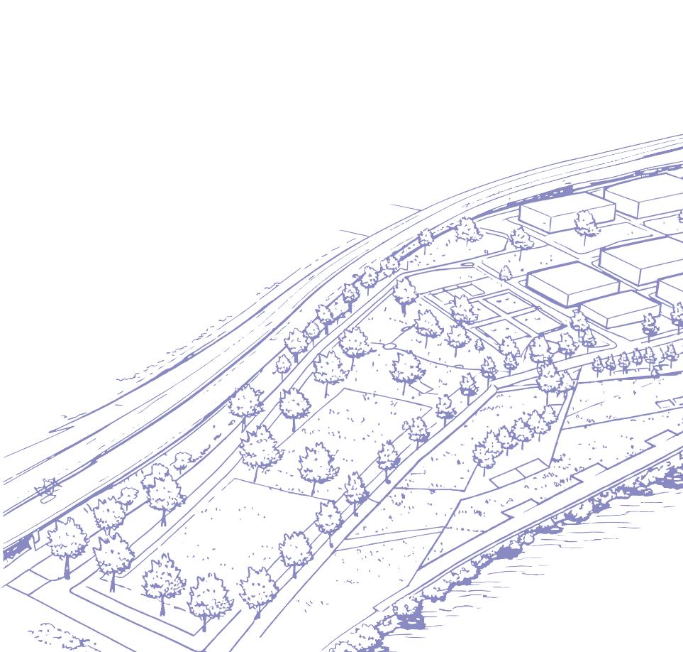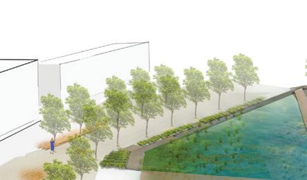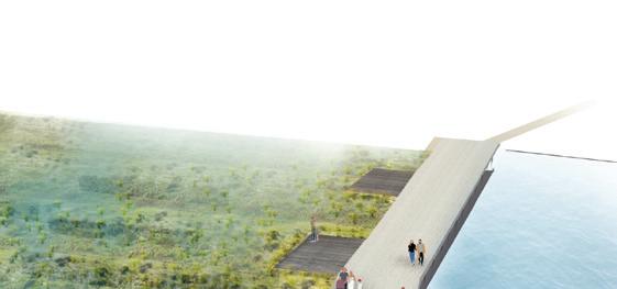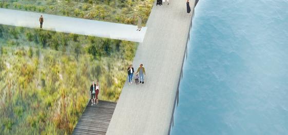 The waterfront is envisioned as a resilient, flood-adapted landscape that anticipates future sea-level rise. A floating boardwalk maintains continuous public access while allowing tidal water and storm flows to move freely beneath it, creating a dynamic and flexible edge condition. This system strengthens the connection between the river, adjacent streetscape, and surrounding development while ensuring longterm ecological and infrastructural resilience.