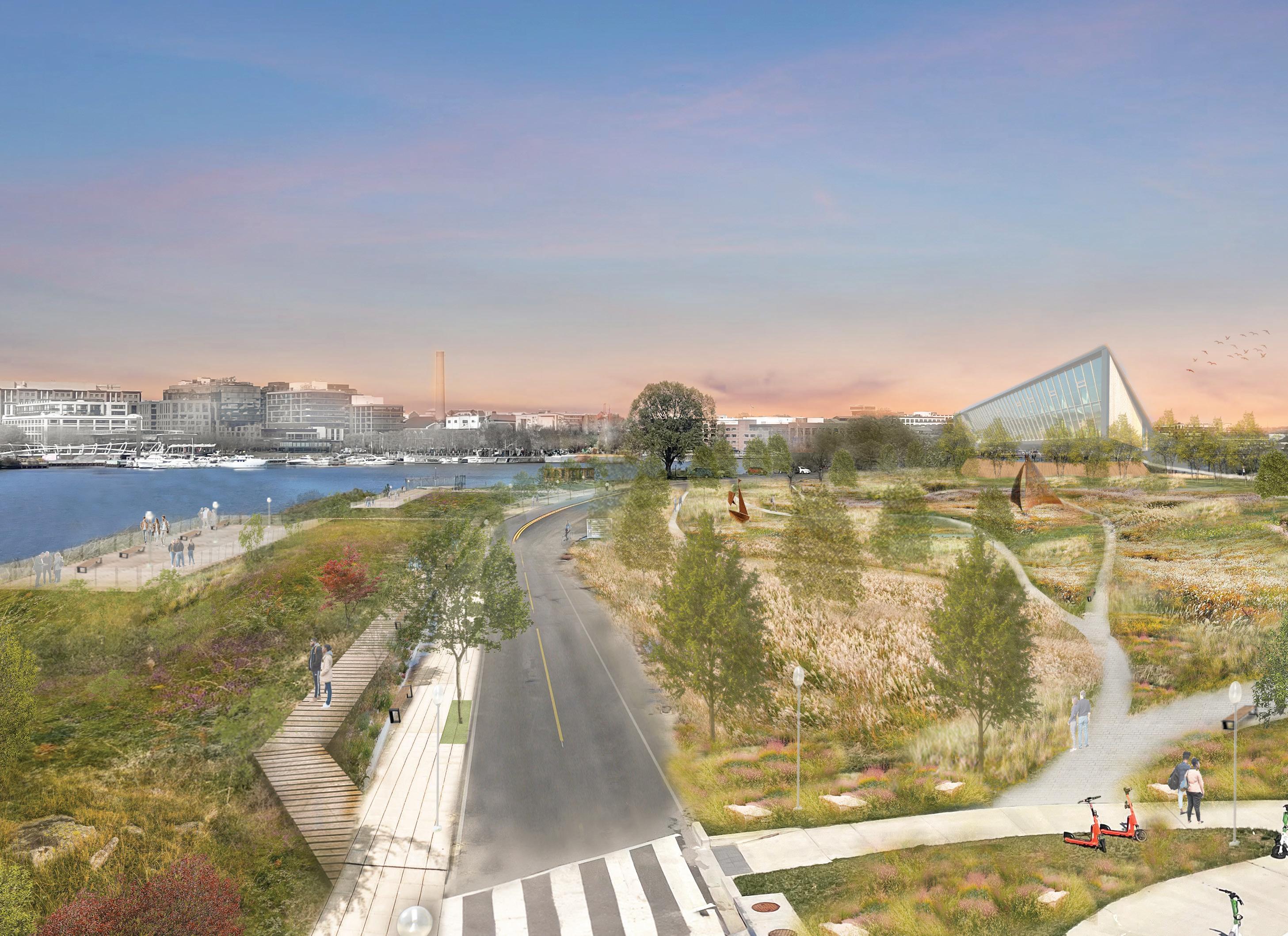 Referencing landscape-as-art precedents such as Storm King, the project transforms the Frederick Douglass bridge crossing into a moment of arrival, where art and river-based infrastructure shape a memorable view into Anacostia.
