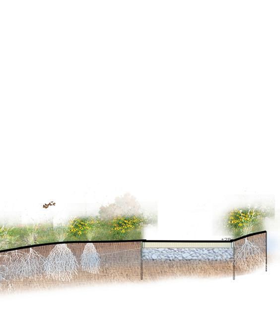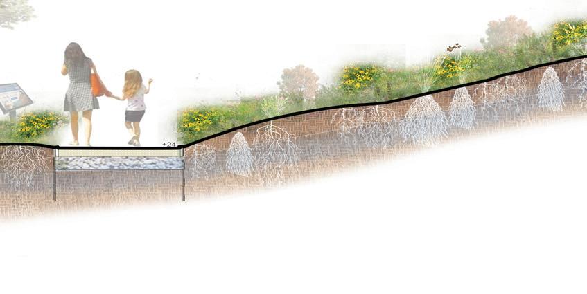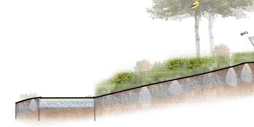 This pollinator meadow uses a seed mix to stabilize slopes while introducing habitat and seasonal blooms along the primary corridor sidewalk.
