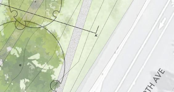 Located between residential housing, the narrow 200-foot long site navigates over 9 feet of elevation change on approach to a primary commercial corridor sidewalk, presenting a key challenge for safe circulation and neighborhood access.