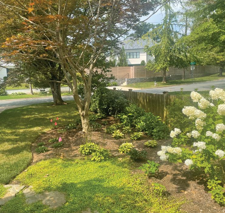 Vibrant yellow and purple plantings complement the existing stone patio, extending from the sunny rain garden near the porch to the shaded rear gate. White-blooming shrubs add structure and layered understory interest beyond the immediate planting areas.