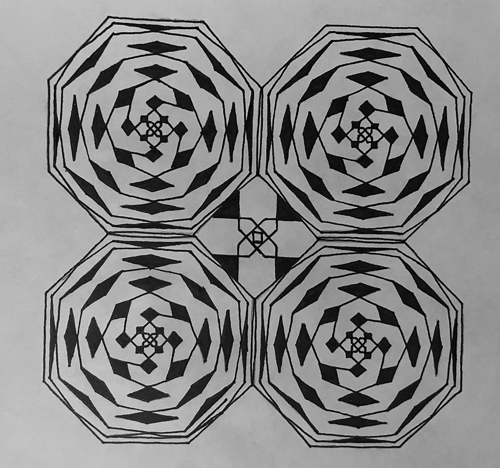 Here you can see some of the initial pattern sketches I made durring the semester. I wanted to try and create something complex for activity 1 to show my understanding of layering and pattern design without knowing we would be developing the pattern throughout the semester. I ended up having to simplify my original idea.