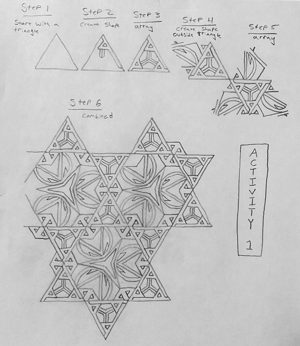 In these activities you can see my development of the original complex pattern that I sketched and an example of how I used aspects of that pattern to create a simplified version for Rhino.