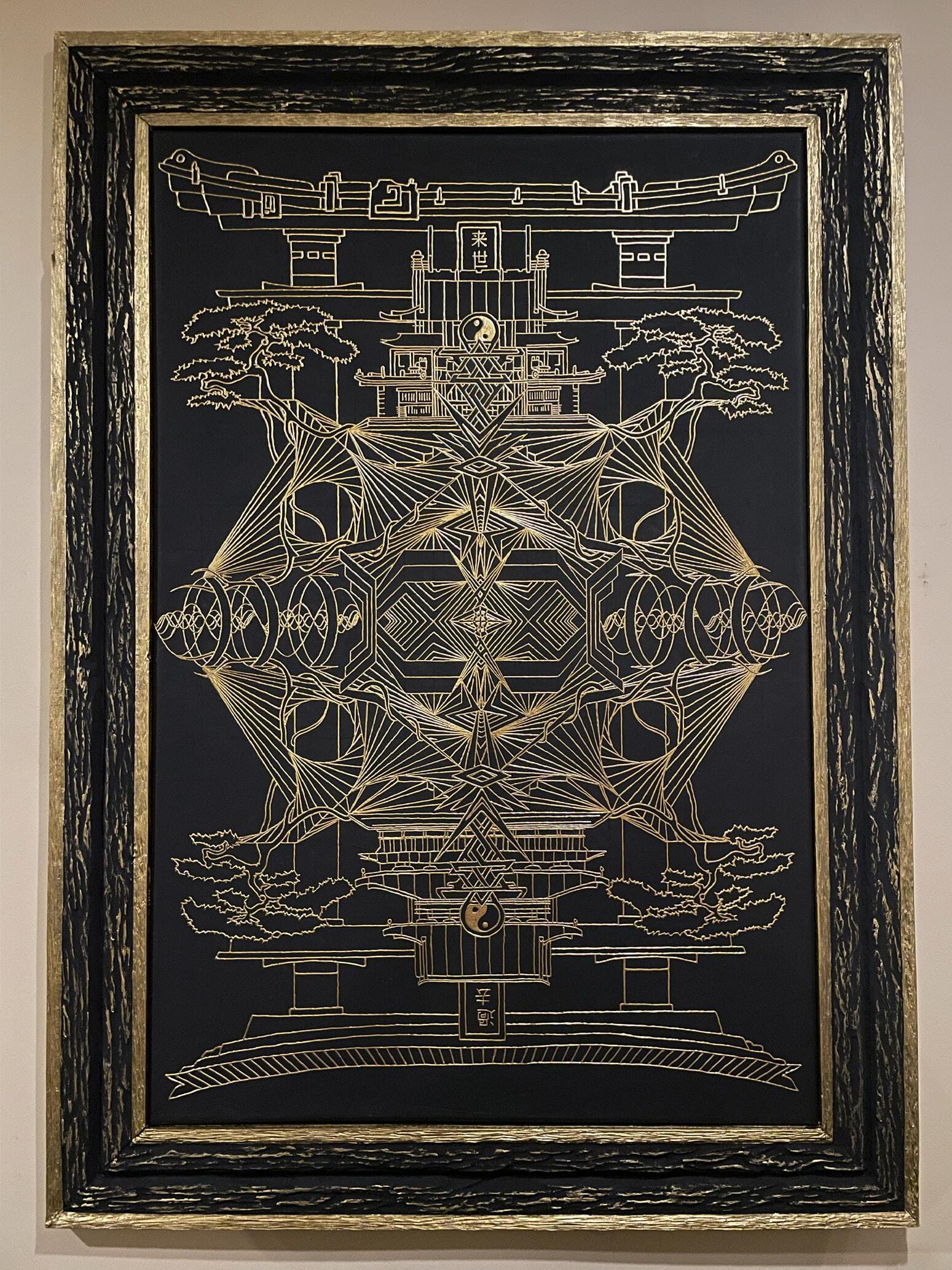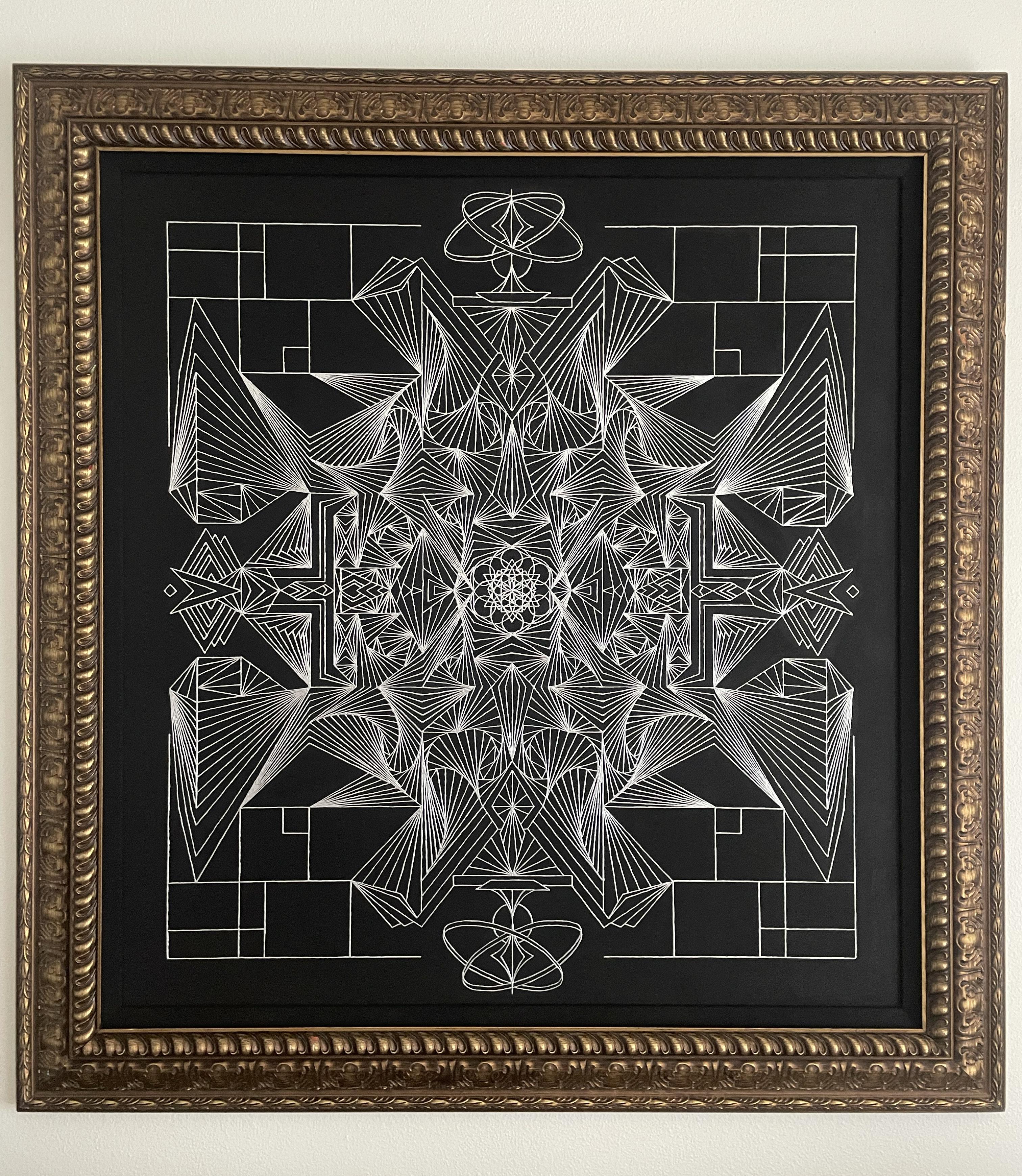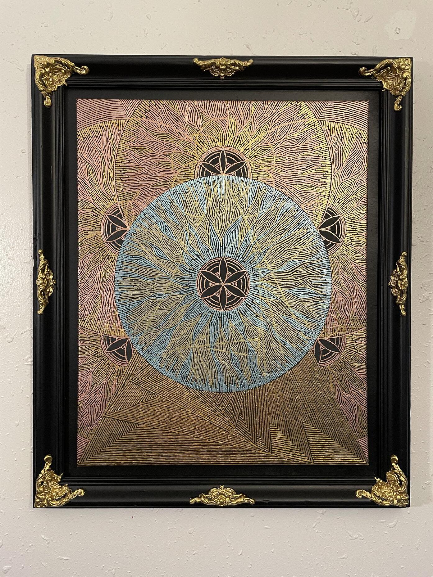 The next page shows a linework drawing I painted for my partner. I start out by creating a golden ratio grid. You can see what some of the grid would look like on the boarder of the painting. This first painting is a 36āx36ā board.