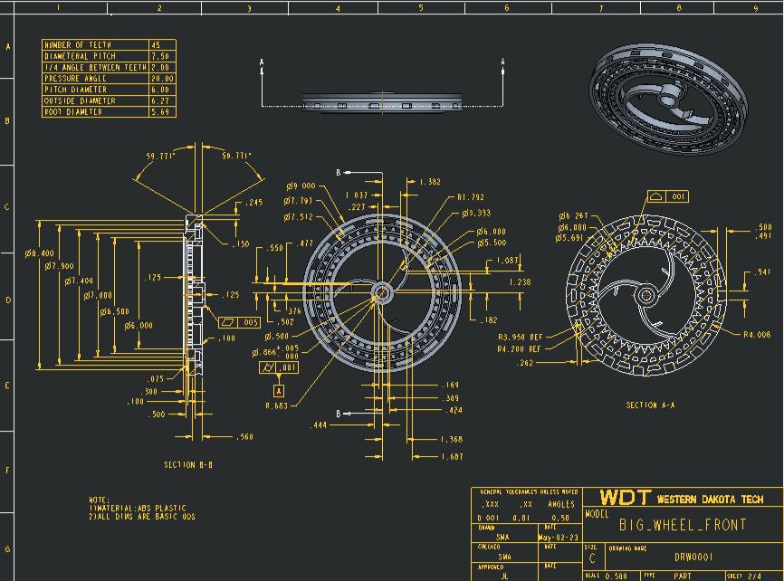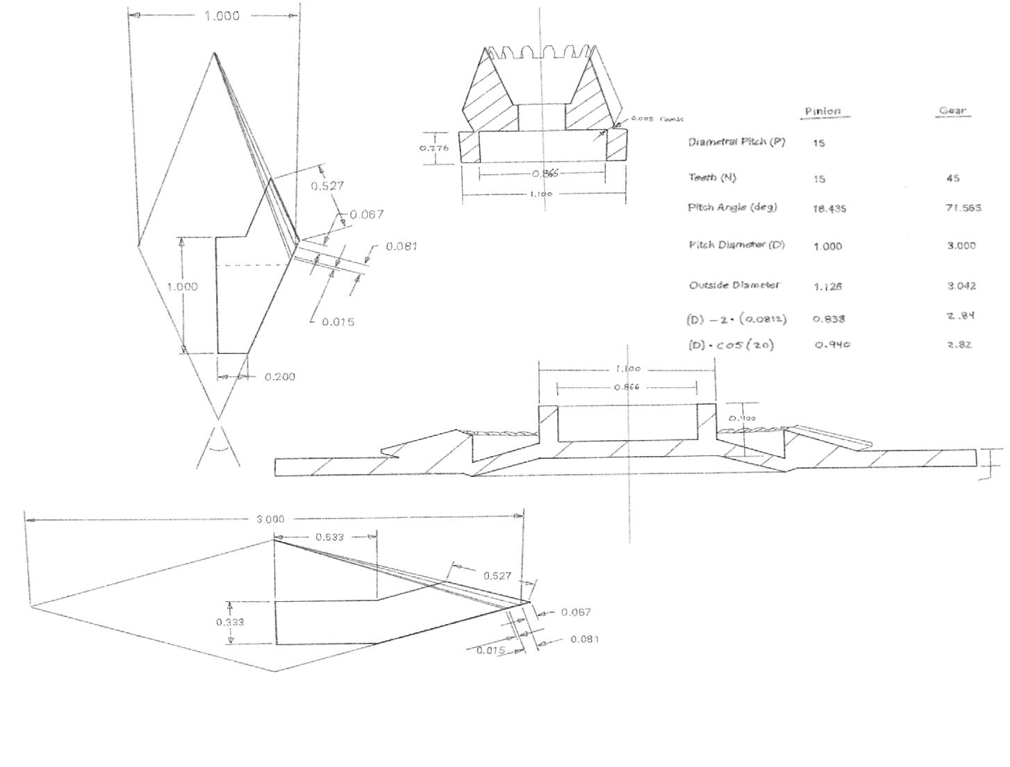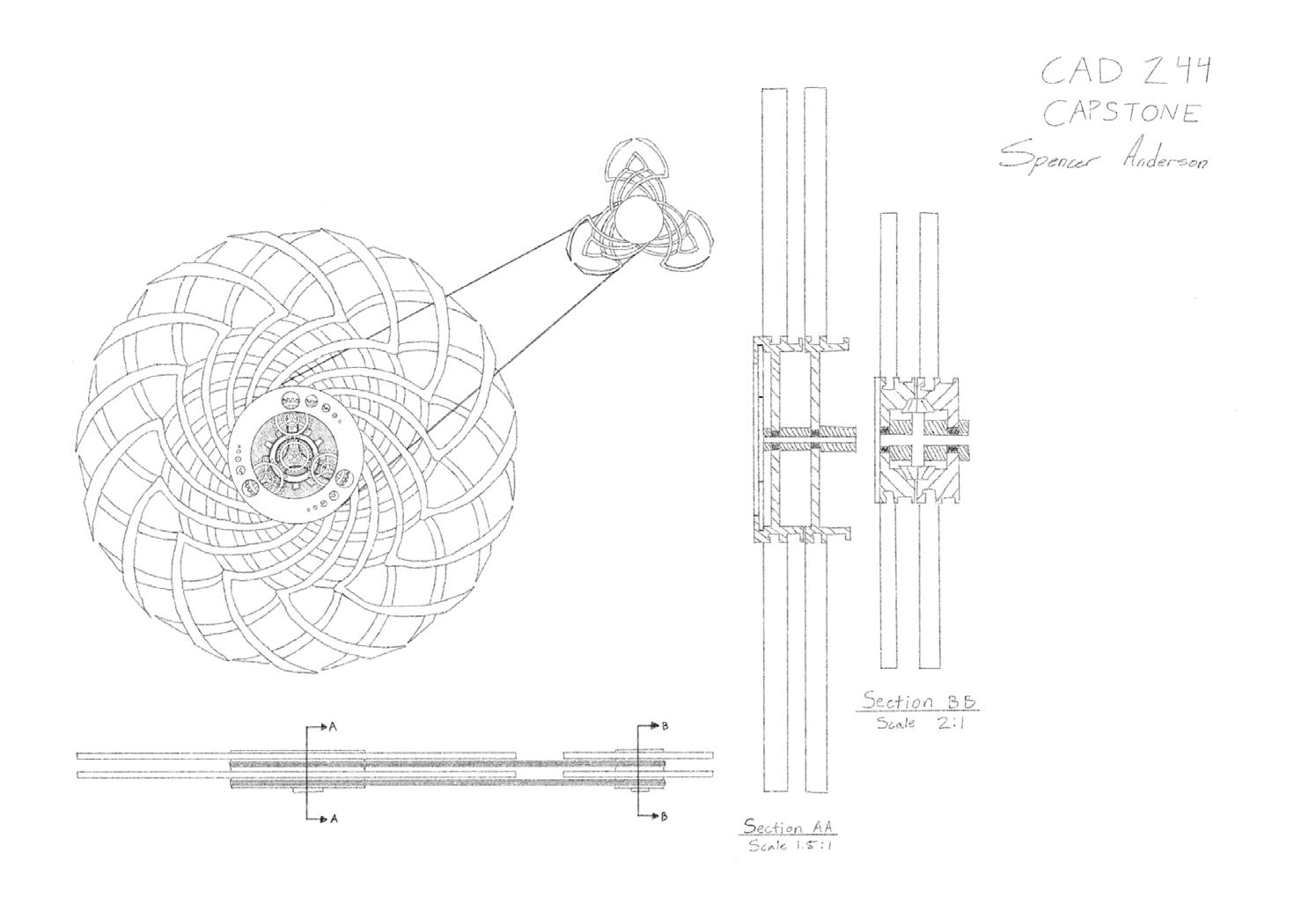 I included my hand drawings of the early designs and part drawings of some of the gears. Below is a picture of the final piece. The optical illusion created when the two wheels spin in opposition is well worth the effort it took to make.