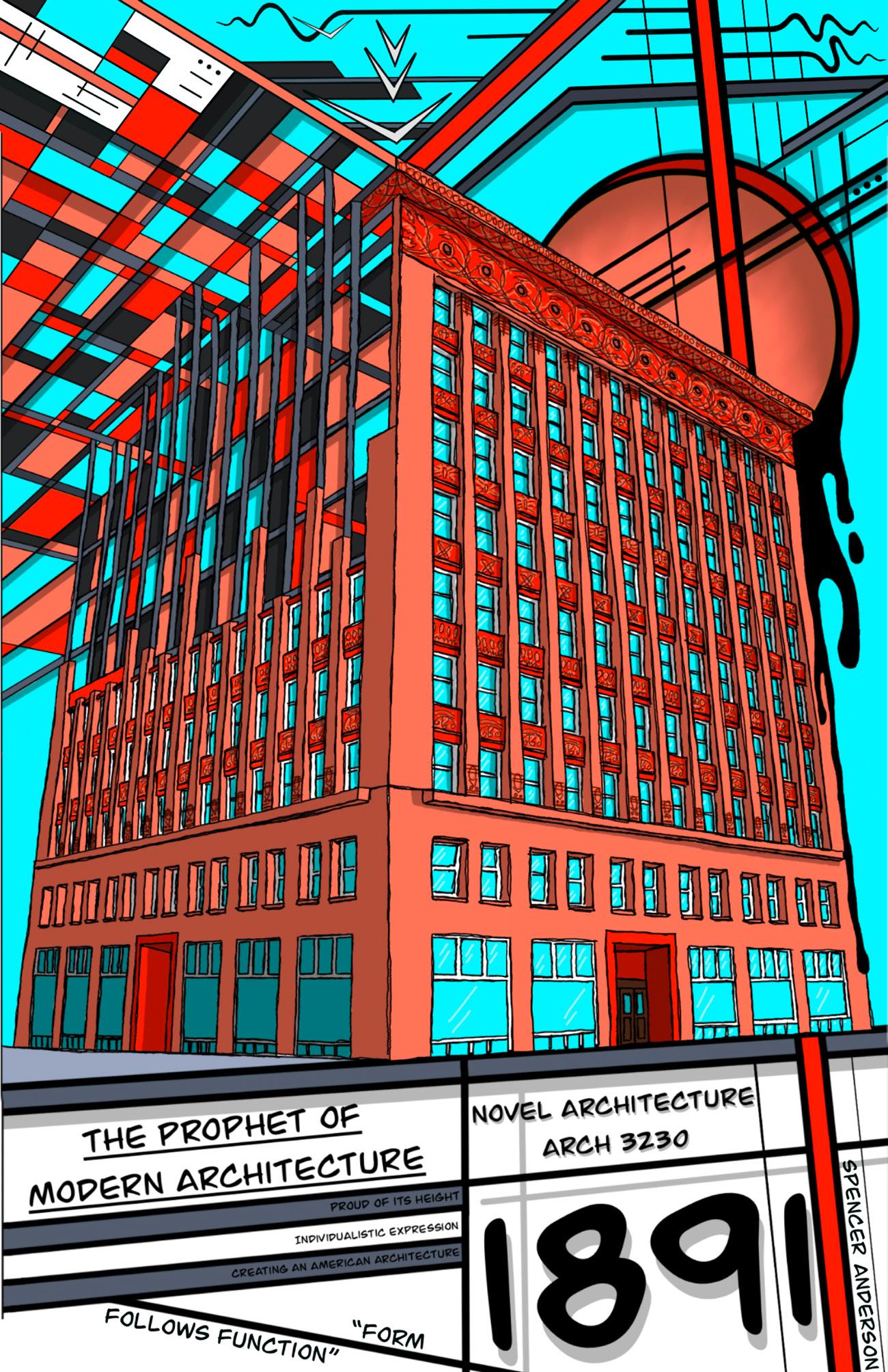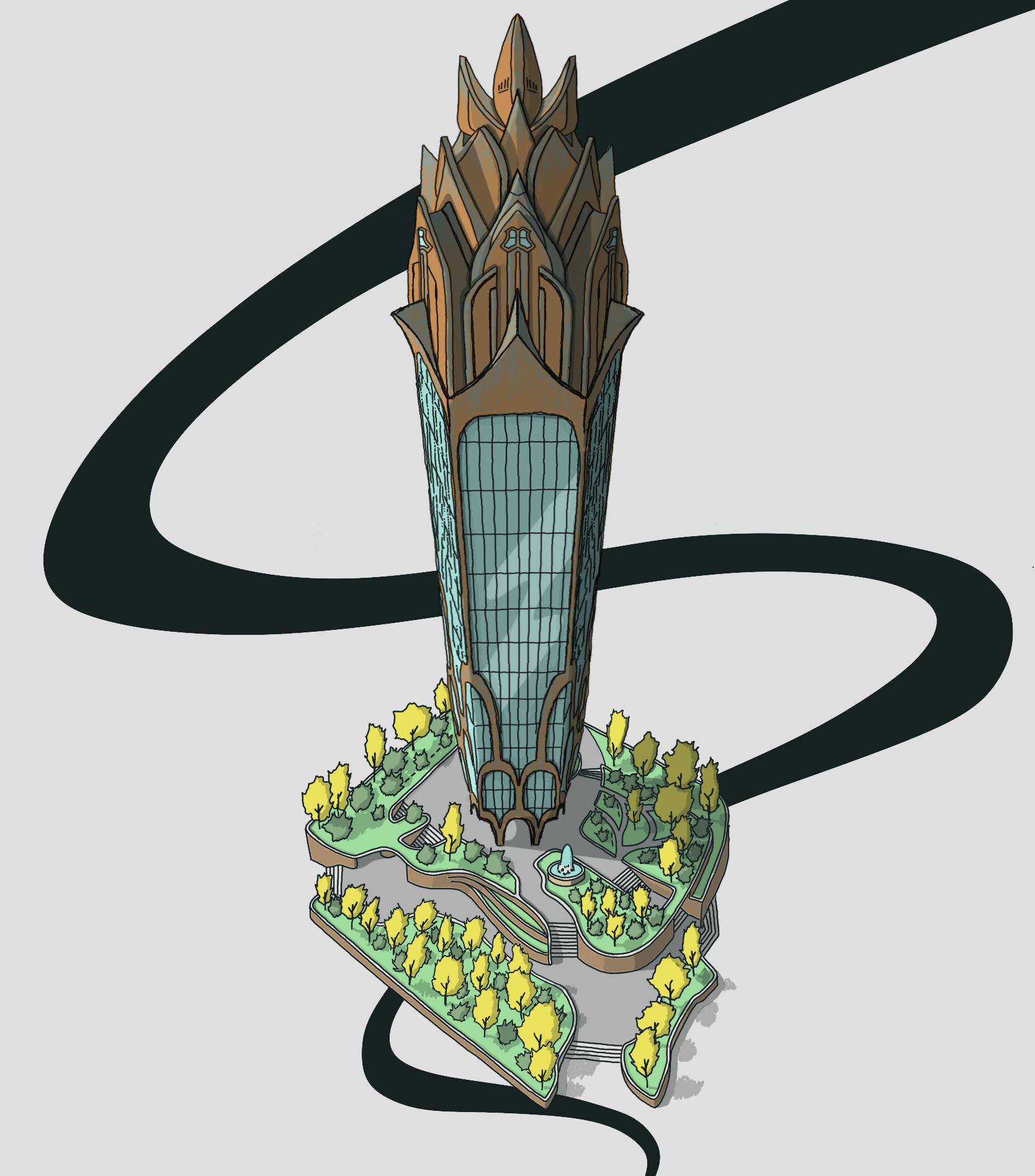 Finally, I included a skyscraper that is designed using the principals laid out by Sullivan, for how a skyscraper should be built. I went for a flower blooming top, with a root like structure toward the base.