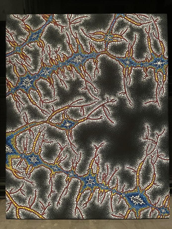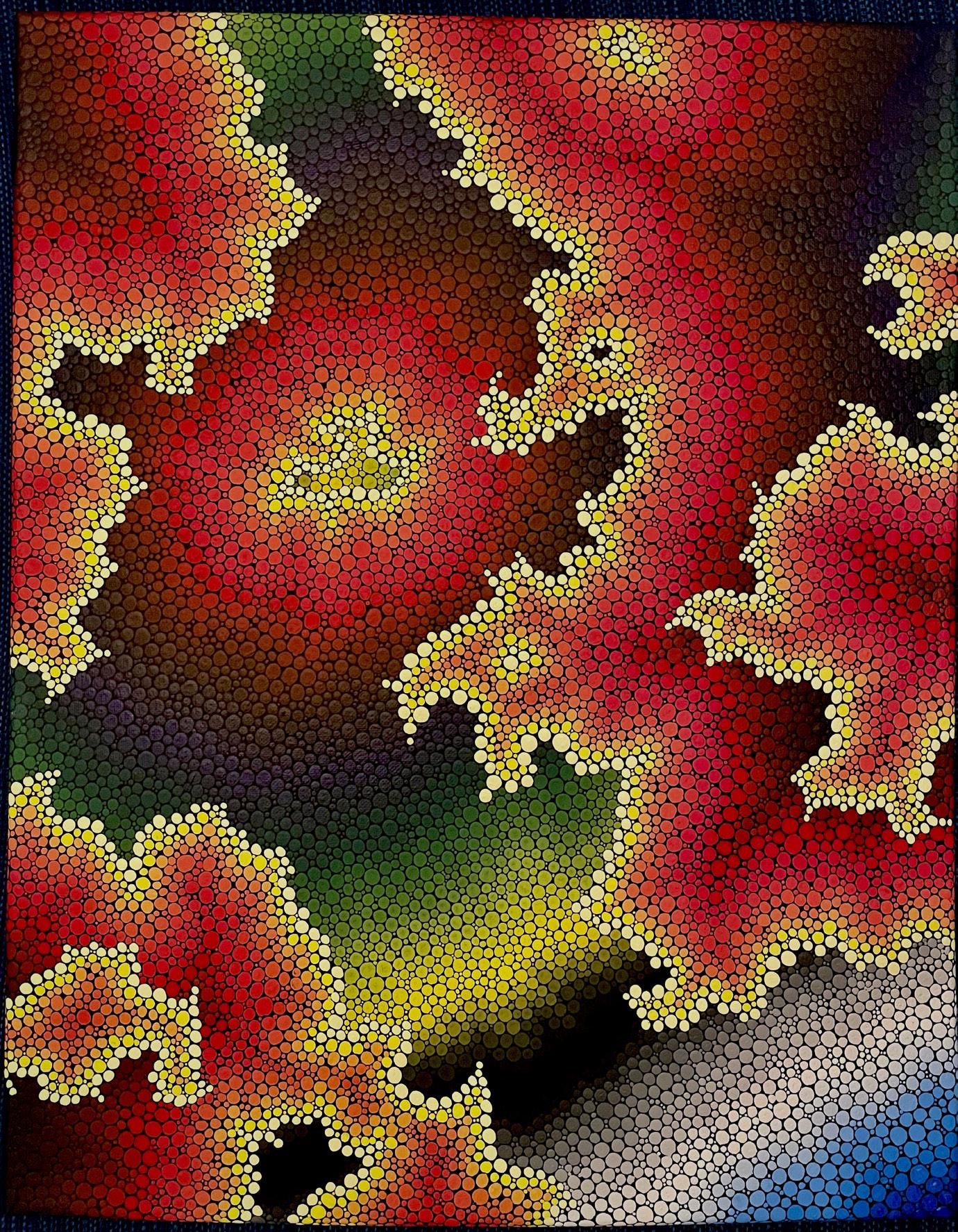 This dot painting, like the one on the previous page, took a very long time to complete. I learned a lot about breathing and drinking plenty of water throughout these paintings. I donāt know if I will ever want to do another dot painting again.