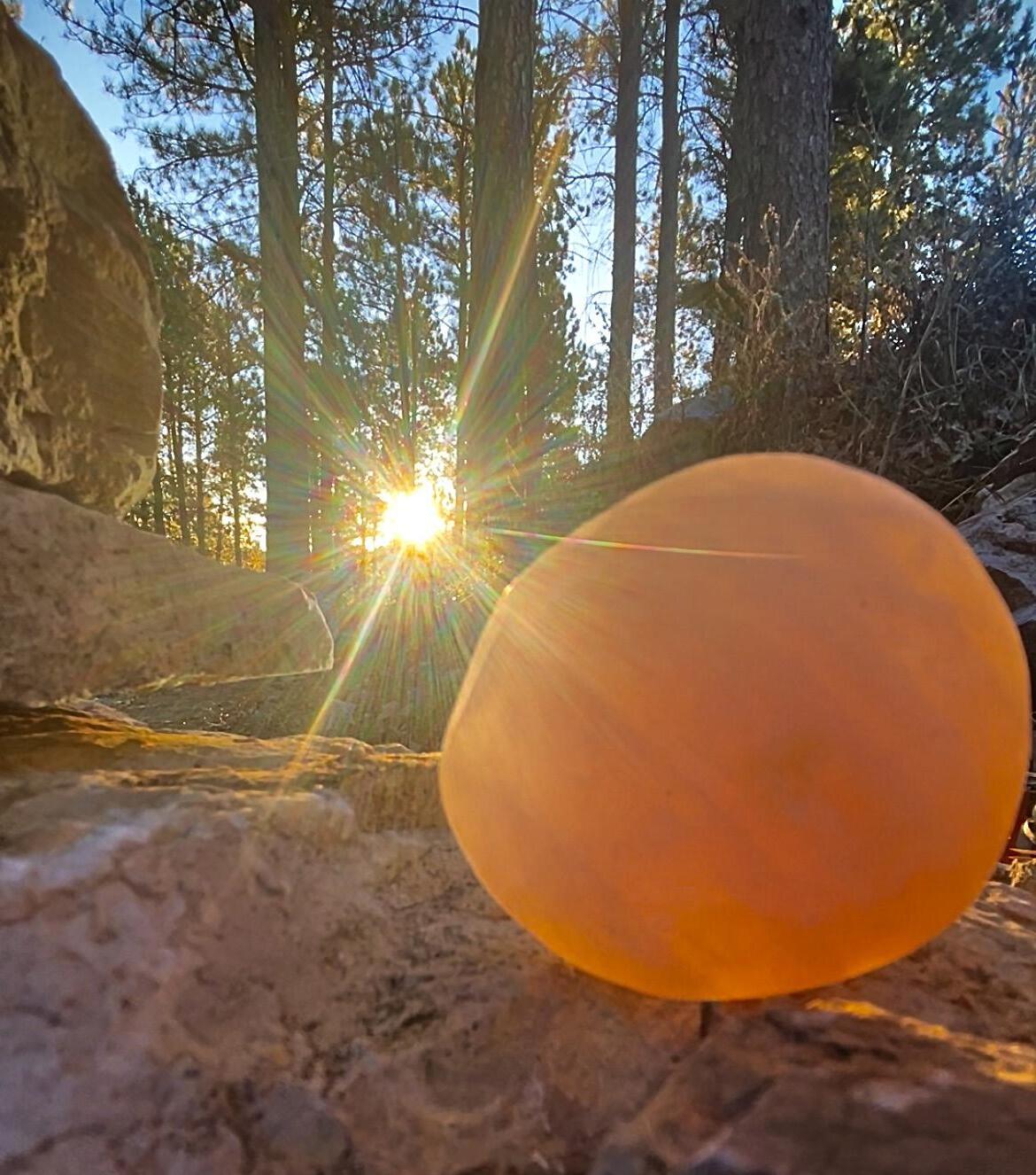 I built a rock marker that went through many iterations because it kept falling over, but eventually I found a shape that was self-supporting. I waited until evening to make the final touches to it, making sure the rocks marked the correct location. I then created a little enclosure with a smoothed piece of quarts in the center, that I knew would light up when the sun hit it.
