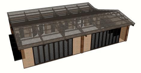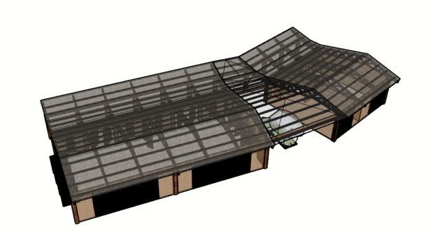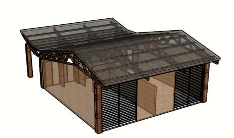 El modulo principal se conforma a partir de una cubierta a tres aguas en diferentes alturas que ayuda a demarcar los espacios de circulación y los de permanencia en el proyecto.