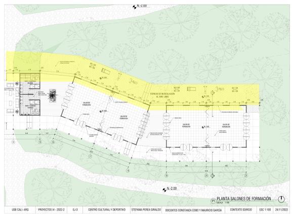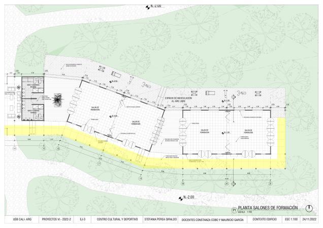 Calle40 N. N.±0.00 N. N.-0.50 N. N.-1.00 SALONDE FORMACION SALONDE FORMACION SALONDE FORMACION SALONDE FORMACION ZONA ADMINISTRATIVA ALMACENAMIENTO COCINA BAÑOS BAÑOCAMERINO HOMBRES BAÑOCAMERINOS MUJERES ENFERMERÍA VESTÍBULO UTR CAFETERÍA BARRAPARAATENDER N. N.-0.50 N. N.-0.50 10 11 12 13 14 15 17 18 19 20 21 9.60 9.60 19.20 N. N.-2.00 N. N.±0.00 N. N.-2.00 N. N.-2.00 8.84 9.60 9.60 19.20 3.57 6.40 6.40 6.40 3.57 9.60 9.60 8.84 ESPACIODEMUSCULACIÓN ALAIRELIBRE 19.20 19.20 A B C 3.20 12.77 9.60 USBCALI-ARQ PROYECTOSVI-2022-2 EJ-3 CENTROCULTURALYDEPORTIVO STEFANIAPEREAGIRALDO 24/11/2022 ESC1:200 CONTEXTOEDIFICIO DOCENTESCONSTANZACOBOYMAURICIOGARCÍA ESCALA1:200 PLANTA2doPISOP2