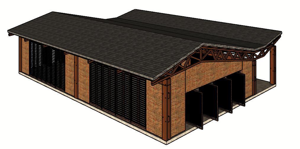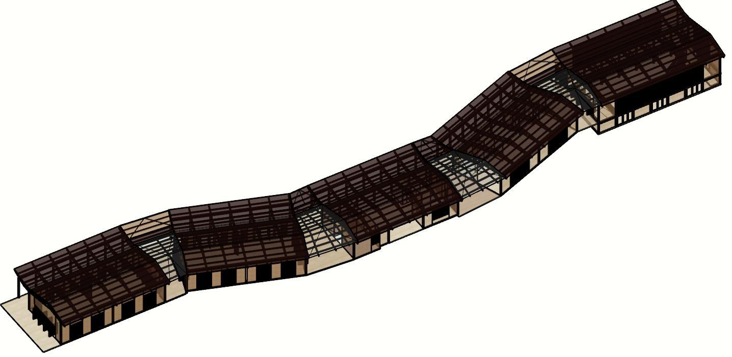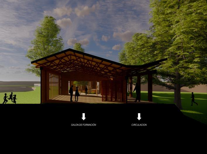 El proyecto se configura a partir de un modulo base siendo este el principal que se encargara de conformar el proyecto arquitectónico, esto con el fin de agrupar varios de estos módulos para así crear las 2 naves del proyecto y replicarlas para conformar un conjunto articulado a partir de la cubierta a 3 aguas, cerramientos en madera y mampostería además de los espacios de transición a modo de patios acristalados que se convierten en las articulaciones de las agrupaciones