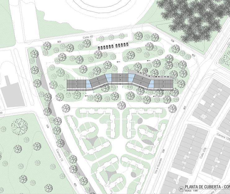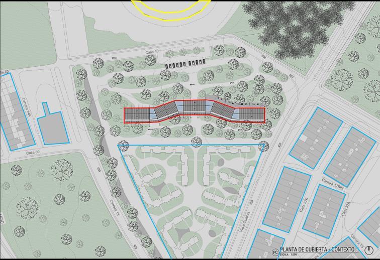 Carrera13 Carrera12BIS Calle 37A Calle 37B 1640 Carrera 14A Calle39 Calle40 Calle37 18 N.-2.00 N. N.-2.00 N. N.-2.00 Calle40 Vía a Guacas USBCALI-ARQ PROYECTOSVI-2022-2 EJ-3 CENTROCULTURALYDEPORTIVO STEFANIAPEREAGIRALDO 24/10/2022 ESC1:500 CONTEXTOGENERAL CONSTANZACOBOYMAURICIOGARCIA ESCALA1:500 PLANTADECUBIERTA-CONTEXTOPC