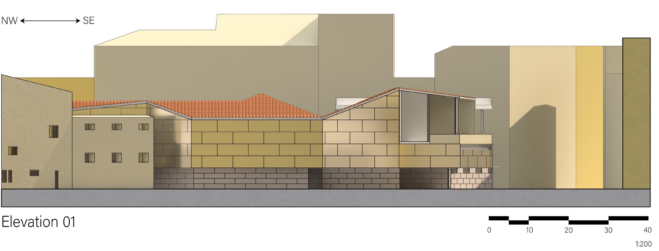 As for materiality, gold panels envelop the upper floors to still respect the surroundings through color and reflection, but separating itself as a new building. On the ground floor, the stone from the piazza continues up onto the wall as panels. This almost creates a feeling of being permanent in the site like it belongs there. The panels connect easily to the existing walls to keep most of the original shape of the building , give a more modern feel , and reduce the amount of waste and CO2 emmission