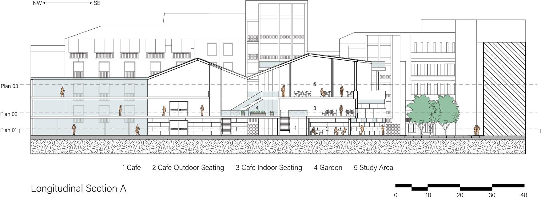 general public circulate on the ground floor. The two entrances into the courtyard allow for people to enter the building from either street. Students who need direct access to the library can go through the narrow cut away from the existing building which creates a feeling of compression and expansion. The plaza is designed for public areas in the front and gets more private towards the library or on the above floors.