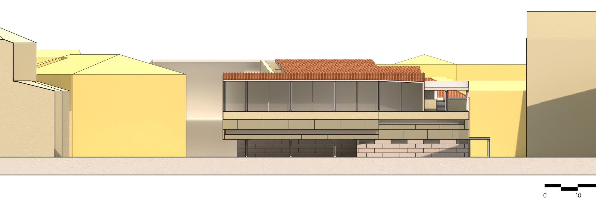 The continuation of the pitched roofs extend out further into the piazza making it more inviting while keeping some Italian style. It also covers the contemporary loggia.