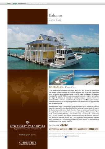 D’une étonnante beauté naturelle, avec un port privé, l’île Cave Cay offre une marina dotée d’un système de quais flottants et de 35 cales de lancement ainsi qu’une piste d’atterrissage privée. La luxueuse maison principale jouit de vues à 360 degrés. Les plans pour 38 bâtiments, d’une superficie totale de 70 000 m2, incluent une maison flottante de 3 étages et une résidence de 2 étages. Un clubhouse, un restaurant, des salles d’eau ainsi que 3 maisons d’invités avec chambres d’hôtel et suites sont en construction. L’ensemble est autosuffisant en eau et l’approvisionnement électrique est assuré par des générateurs diesel. Il est possible de s’approvisionner avec de l’énergie solaire. Stunning natural beauty, a protected and private, deep-water harbor and marina with floating dock system and 35 dock slips, plus a 2 800-foot private airstrip. Located in the heart of the Exumas and near to famed Musha Cay, Cave Cay is one of the most beautiful spots in the world. The luxurious main house is move-in ready and enjoys 360-degree views. Plans for 38 buildings totaling 70 000 sq. f. include a three-story houseboat with a marina shop and a twi-story residence, plus staff and maintenance buildings. A clubhouse and restaurant, shower and bathroom facilities, and 3 guest houses with hotel rooms and suites are under construction. It is self-sufficient with water and power supplied by diesel generators, while solar energy can be made available. Prix / Price : CHF CHF 4 - 8 Millions