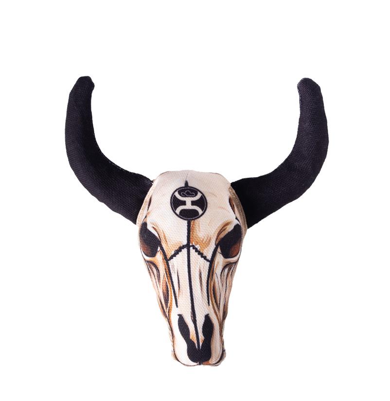 Soft plush with polyester webbing · Unique, realistic, 3D longhorn skull design · Soft interior for comfy cuddling · Stylish Hooey Hands Up logo on a printed canvas exterior that stands up to use · Hidden squeaker for interactive play · Crinkle paper