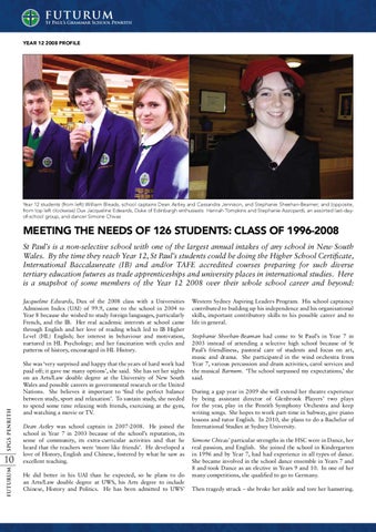 Meeting the needs of 126 students: class of 1996-2008 St Paul’s is a non-selective school with one of the largest annual intakes of any school in New South Wales. By the time they reach Year 12, St Paul’s students could be doing the Higher School Certificate, International Baccalaureate (IB) and and/or TAFE accredited courses preparing for such diverse tertiary education futures as trade apprenticeships and university places in international studies. Here is a snapshot of some members of the Year 12 2008 over their whole school career and beyond:
