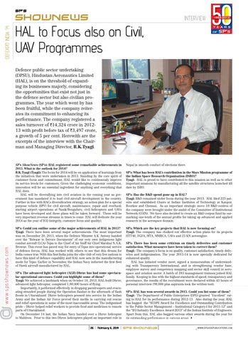 Nepal in smooth conduct of elections there. SP’s: What has been HAL’s contribution in the Mars Mission programme of the Indian Space Research Organisation (ISRO)? Tyagi: HAL is proud to have contributed to this mission as well as to other important missions by manufacturing all the satellite structures launched till date by ISRO. SP’s: Has the R&D spend gone up in HAL? Tyagi: R&D remained under focus during the year 2013. HAL filed 225 patents and established Chairs at Indian Institutes of Technology at Kanpur, Roorkee and Chennai. As an important strategic move 10 R&D centres of the company were brought under the ambit of the Committee of Institutional Network (COIN). We have also decided to create an R&D corpus fund by earmarking one-tenth of the annual profits for taking up advanced and applied research in the aerospace domain. SP’s: Which are the key projects that HAL is now focusing on? Tyagi: The company has chalked out effective action plans for its projects HTT40, FGFA, MTA, MMRCA, UAVs and 25 KN aeroengine. SP’s: There has been some criticism on timely deliveries and customer satisfaction. What measures have been taken to correct them? Tyagi:: The company’s focus is on quality, customer satisfaction, timely deliveries and indigenisation. The year 2013-14 is now specially dedicated for enhanced quality. HAL has initiated vendor meet, signed a memorandum of understanding with Transparency International, and is strengthening vendor base, employee survey and competency mapping and sector skill council in aerospace and aviation sector. A batch of 285 management trainees joined HAL family. Keeping in line with the highest standards of speed, transparency and governance, the results of the recruitment were declared within 45 hours of personal interview (98,000 plus aspirants took the written test). SP’s: HAL has won several awards in 2013. Could you list some of them? Tyagi:: The Department of Public Enterprises (DPE) granted "Excellent" rating to HAL for its performance during 2012-13. Also during the year, HAL has bagged the “SCOPE Award for Excellence and Outstanding Contribution to the Public Sector Management – Institutional Category-I for 2011-12” and the “IEI Industry Excellence Award 2013” of the Indian Institute of Engineers. Apart from this, HAL also bagged various other awards during the year for its outstanding performance in various areas. • SP’S SHOWNEwS