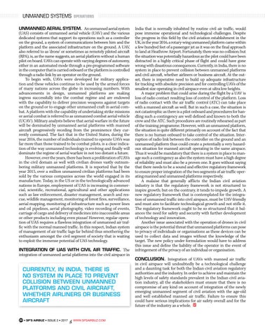 India that is normally inhabited by routine civil air traffic, would pose immense operational and technological challenges. Despite the progress in this field by the civil aviation establishment in the UK, in the year 2016, a rotary-wing unmanned platform came within a few hundred feet of a passenger jet as it was on the final approach to land at Heathrow Airport. Fortunately, there was no collision; but the situation was potentially hazardous as the pilot could have been distracted in a highly critical phase of flight and could have gone wrong with disastrous consequences. Currently, in India, there is no system in place to prevent collision between unmanned platforms and civil aircraft, whether airliners or business aircraft. At the outset, there is imperative need to build up adequate infrastructure for tracking with absolute precision and for controlling UAVs of the smallest size operating in civil airspace even at ultra low heights. A major problem that could arise during the flight by a UAV is loss of radio contact resulting loss of control of the platform. Loss of radio contact with the air traffic control (ATC) can take place with a manned aircraft as well. But in such a case, the situation is not catastrophic as there is a pilot onboard and procedures for handling such a contingency are well defined and known to both the crew and the ATC. Such procedures are routinely rehearsed as part of the training programme. However, with an unmanned platform, the situation is quite different primarily on account of the fact that there is no human onboard to take control of the situation. Interruption of radio link between the controller on the ground and an unmanned platform thus could create a potentially a very hazardous situation for manned aircraft operating in the same airspace. Thus it would be mandatory that there is a system in place to manage such a contingency as also the system must have a high degree of reliability and must also be a proven one. It goes without saying that there needs to be a sound and effective regulatory framework to ensure proper integration of the two segments of air traffic operating manned and unmanned platforms respectively. A malaise that generally afflicts the Indian civil aviation industry is that the regulatory framework is not structured to inspire growth; but on the contrary, it tends to impede growth. A new regulatory framework that is contemplated for the integration of unmanned traffic into civil airspace, must be UAV-friendly and must aim to facilitate technological growth and not stifle it. The regulatory framework ought to be so structured that it balances the need for safety and security with further development of technology and innovation. Another issue associated with the operation of drones in civil airspace is the potential threat that unmanned platforms can pose to privacy of individuals or organisations as these devices can be used to collect data and images without the knowledge of the target. The new policy under formulation would have to address this issue and define the liability of the operator in the event of infringement of the privacy of an individual or organisation. Conclusion. Integration of UAVs with manned air traffic in civil airspace will undoubtedly be a technological challenge and a daunting task for both the Indian civil aviation regulatory authorities and the industry. In order to achieve and maintain the high levels of safety standards prevalent in the Indian civil aviation industry, all the stakeholders must ensure that there is no compromise of any kind on account of integration of the newly emerging unmanned segment of civil aviation with the age-old and well established manned air traffic. Failure to ensure this could have serious implications for air safety overall and for the future of the industry as a whole. SP
